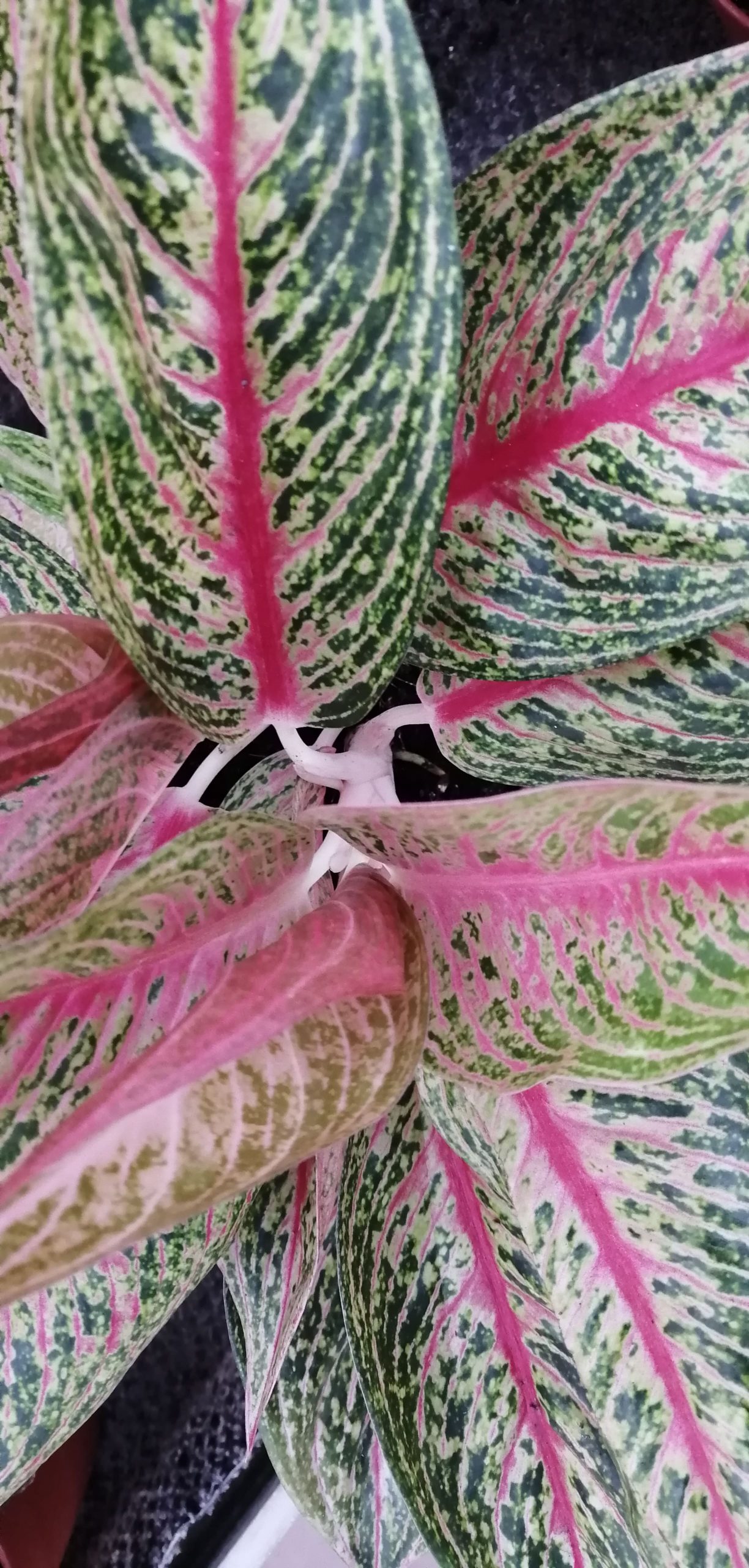 Grandi foglie a fondo verde scuro con venature rosso fragola e pesantemente macchiate di crema e varie tonalità di rosa. Davvero spettacolare.
