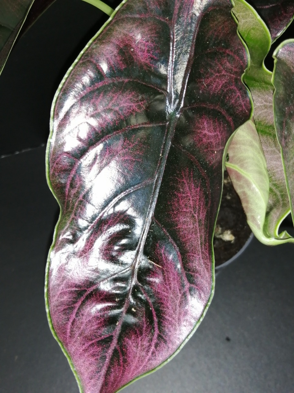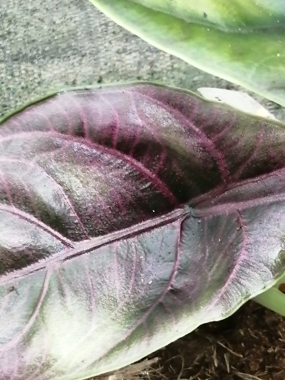 Le foglie sono medie, a forma di ali di un colore difficile da descrivere: bronzo con riflessi cangianti e nervature più scure ed evidenti.