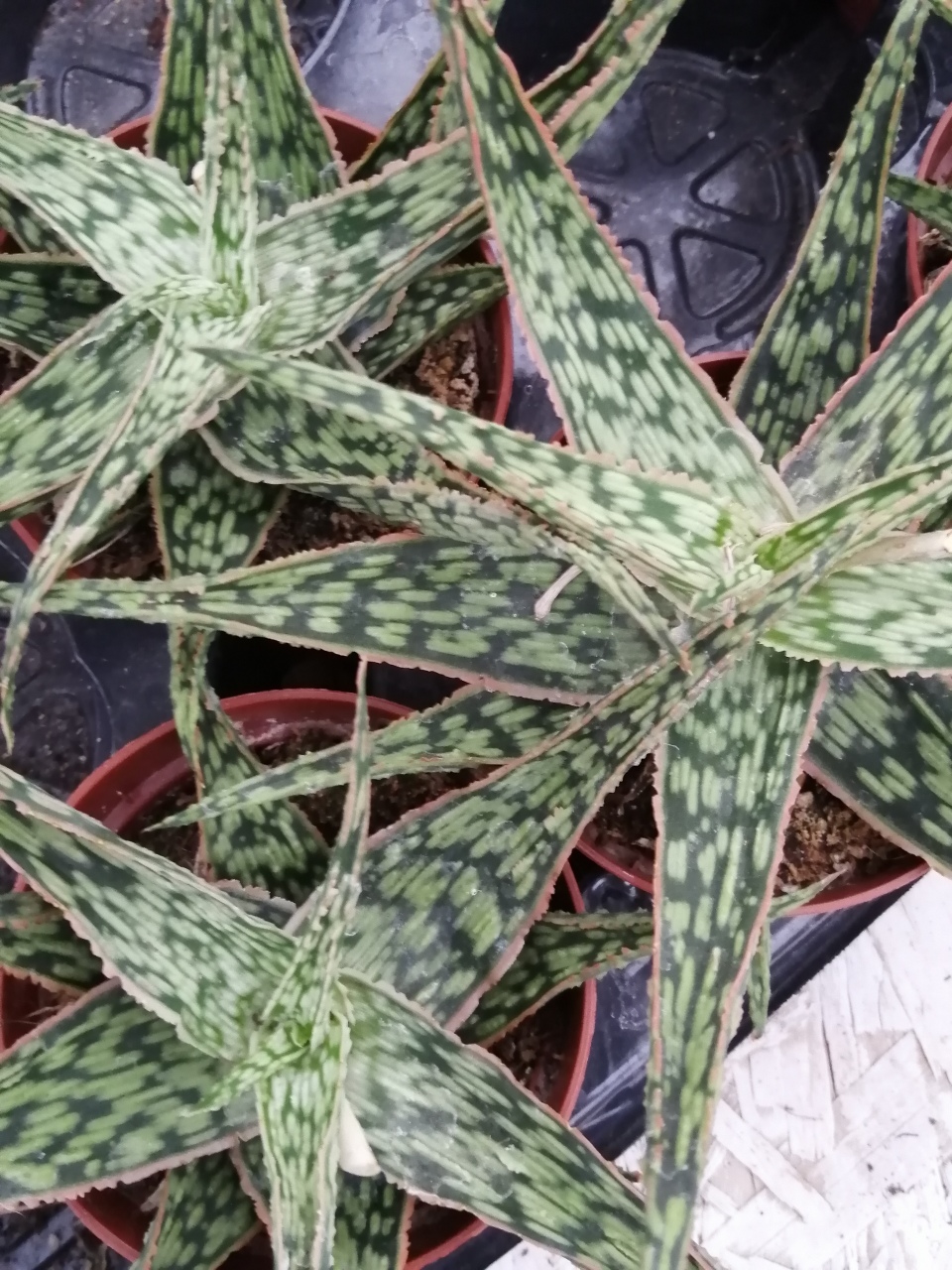 La Aloe Christmas Carol è una nuova selezione.  Forma una rosetta di foglie carnose e succulente, erette, verde  molto scuro irregolarmente screziata di bianco e orlata di arancio, molto rugose al tatto.