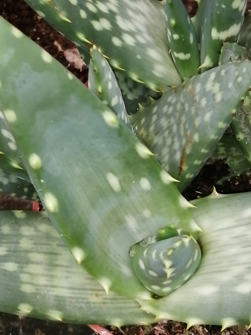 La Aloe Jurassic Dino (paradisicum) è una nuova selezione.  Forma una rosetta di foglie carnose, e succulente verde oliva puntinate di verde giallo.