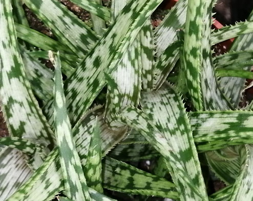 La Aloe Jurassic Spider è una nuova selezione. Forma una rosetta di foglie carnose e succulente verde chiaro puntinate e screziate pesantemente di verde grigio.