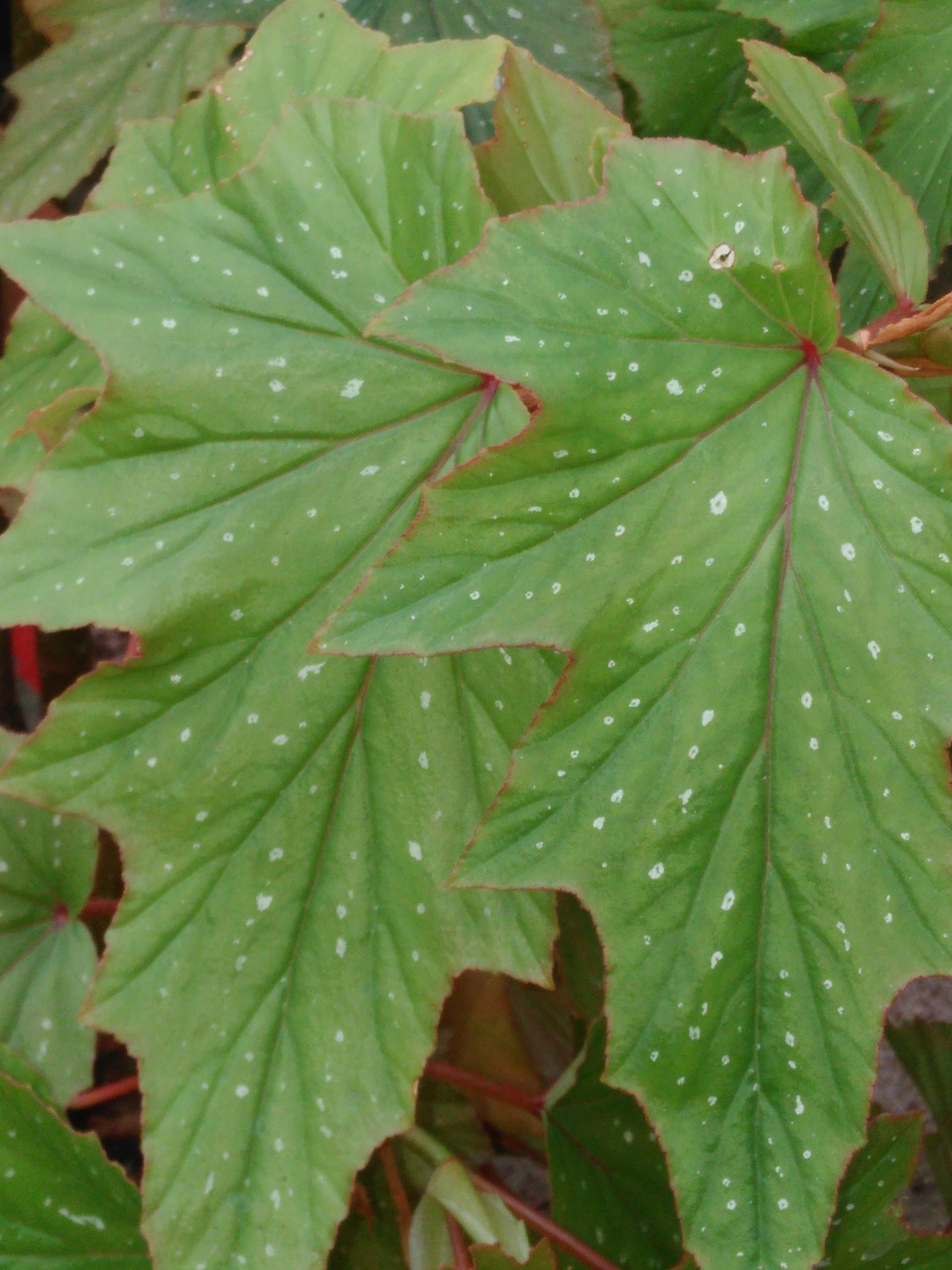 Begonia bambusiforme di grandi dimensioni e rapida crescita. Anche le foglie sono grandi, a margini frastagliati, verde oliva scuro con macchie bianche. Fiori in mazzi rosa.