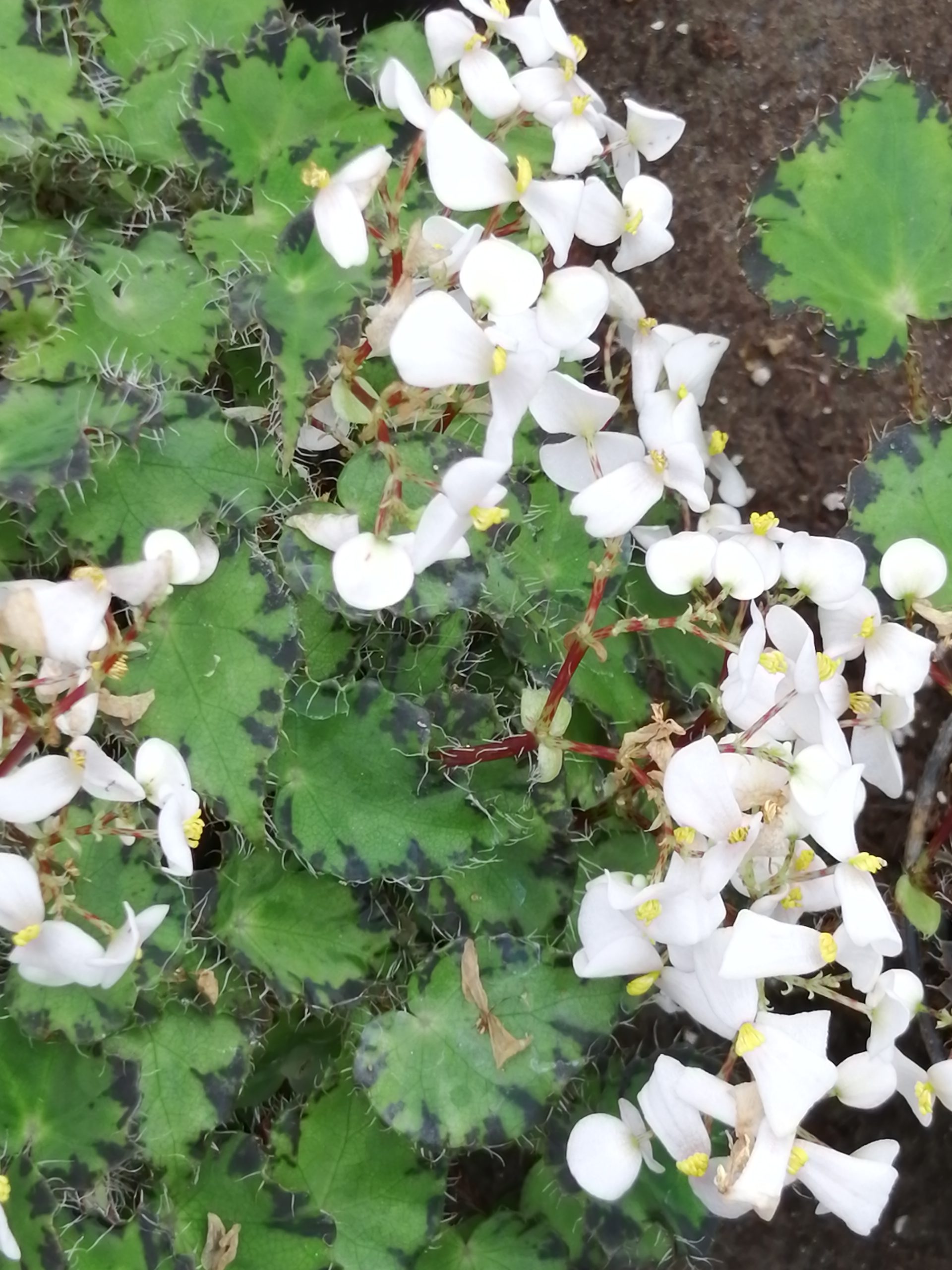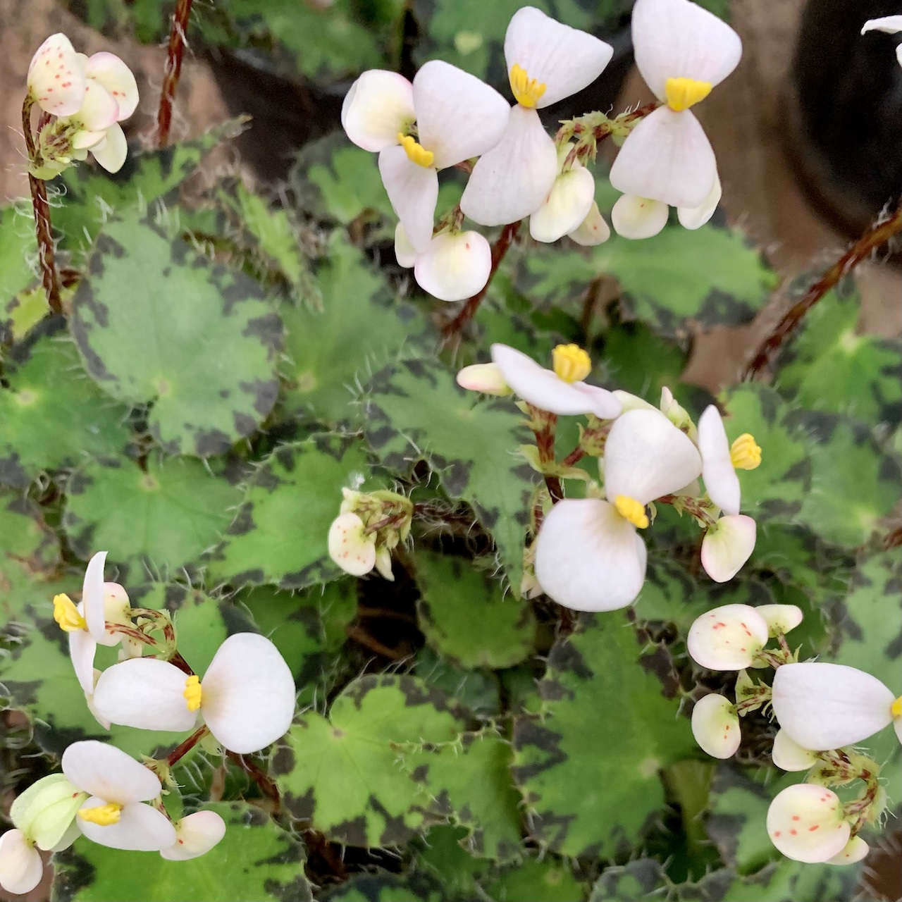 Piccola, nana, compatta, questa begonia ha foglie piccole, verde intenso con margine nero. I fiori numerosi raccolti in piccoli mazzetti, sono bianchi sfumati di rosa. Fiorisce in primavera.