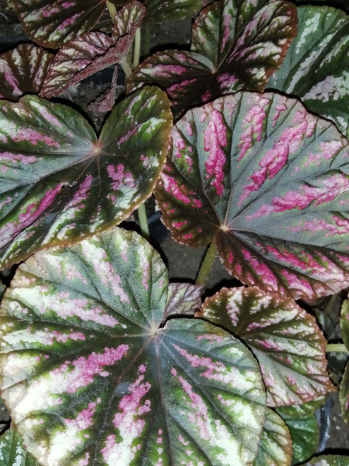 La begonia Candy Stripes è una rizomatosa, dalle grandi foglie arrotondate verde scurissimo quasi nere, incredibilmente striate di rosa metallico.