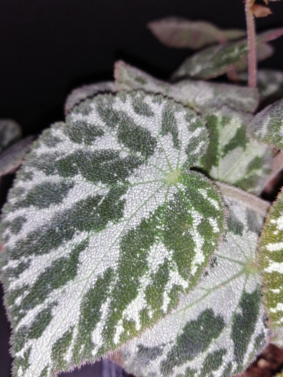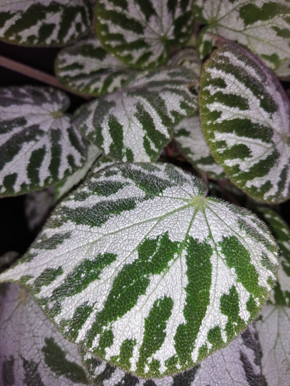 Ha un magnifico fogliame vellutato verde scuro, con venature argentee. I fiori sono bianchi. Il portamento è leggermente ricadente e crescendo forma un cespuglio arrotondato e folto.