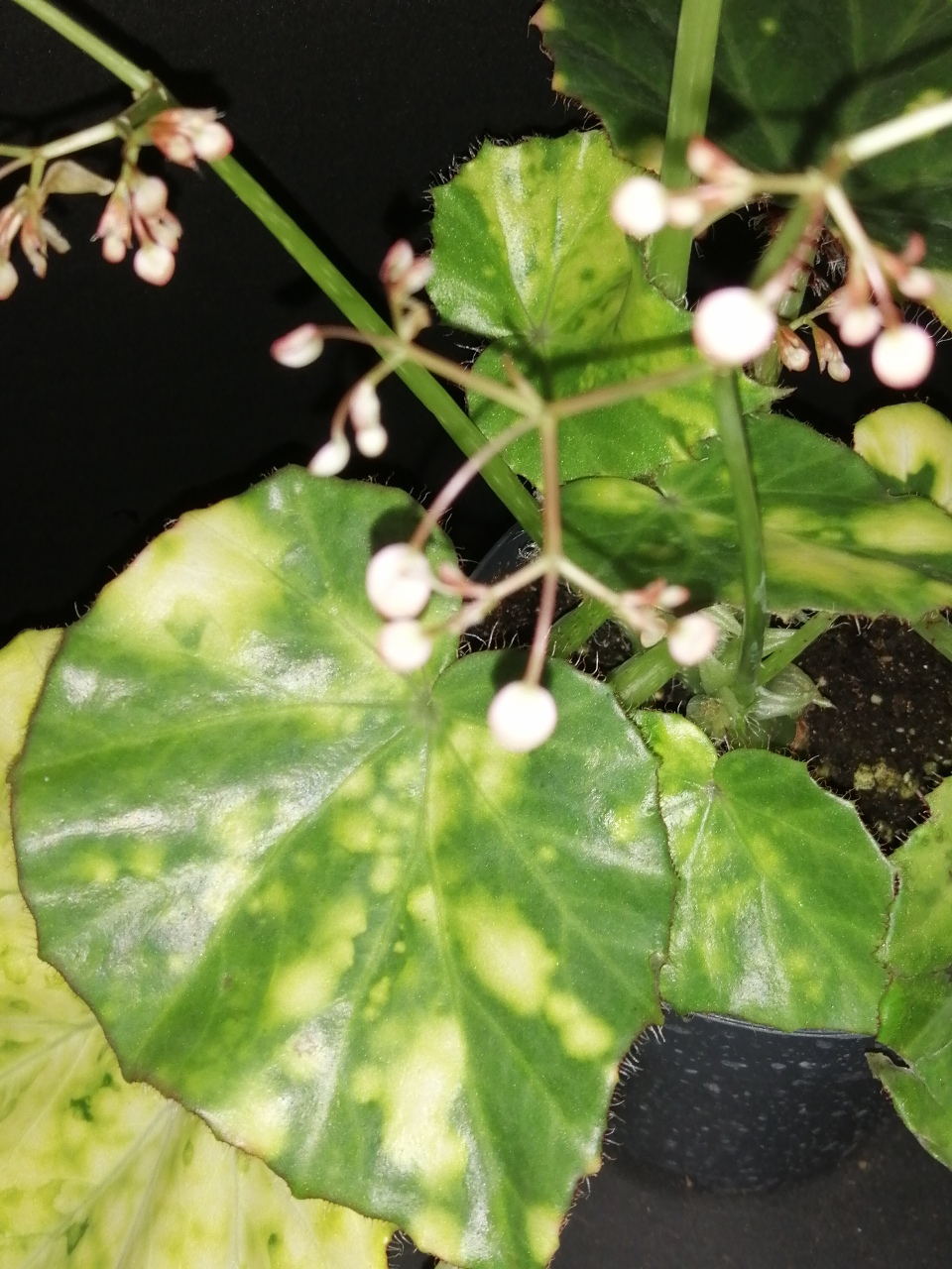 Begonia rizomatosa richiede luce diffusa e terriccio ben drenante.  Le foglie sono grandi, tondeggianti con i tipici manicotti sul picciolo e sotto la foglia. Interessante maculatura gialla sulla foglia. Fiori rosa.