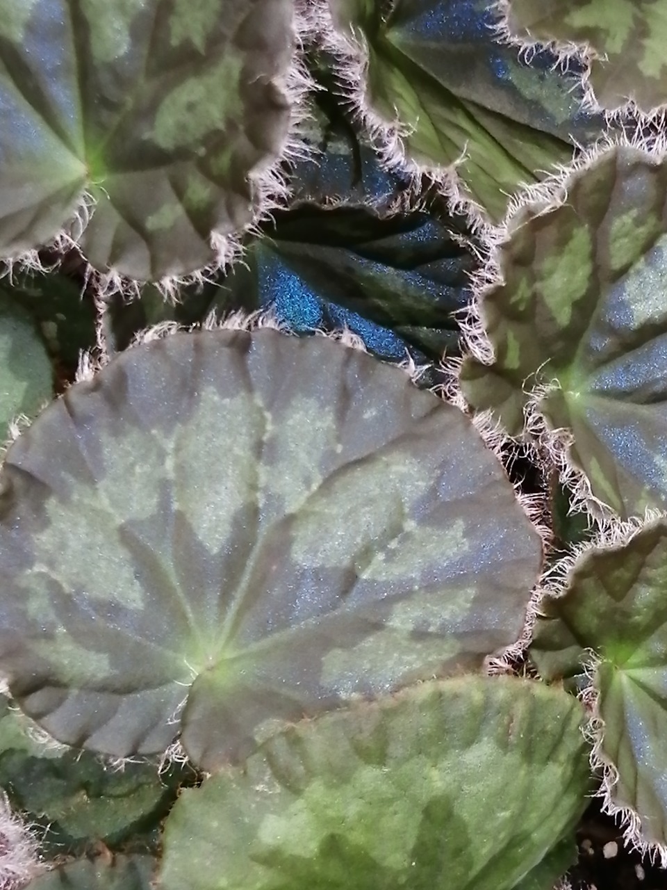 Ha grandi foglie arrotondate che hanno una spiccata iridescenza, molto irsute ai bordi. I fiori sono alti oltre le foglie. Se illuminate al buio riflettono la luce blu azzurra.