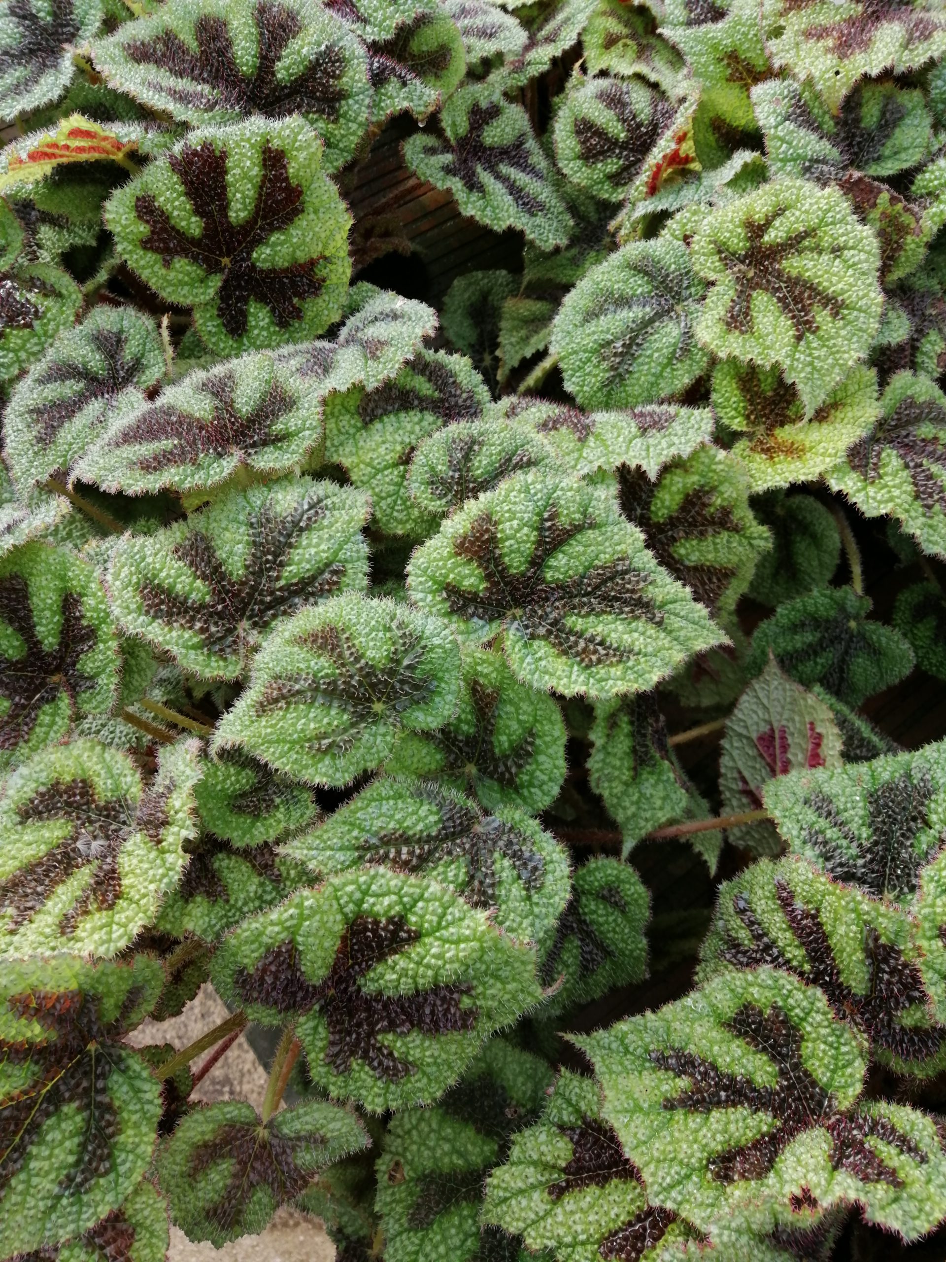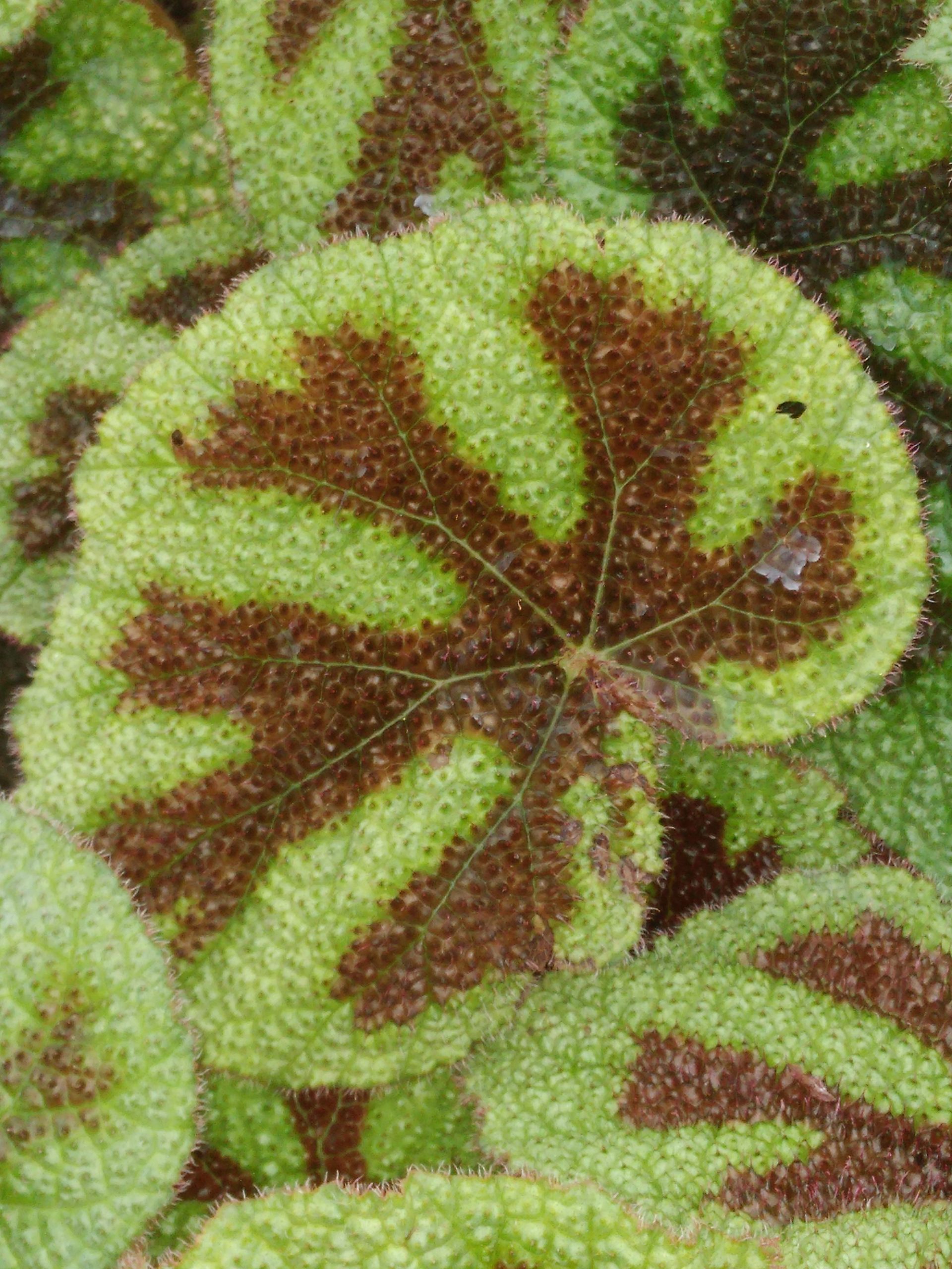 Conosciuta anche come Iron Cross, per la particolare macchia bruna sulla foglia verde mela. E’ una rizomatosa di grande effetto. I lunghi piccioli pelosi portano grandi foglie la cui superficie è interamente ricoperta da piccoli rilievi dal centro dei quali spunta un corto peletto rossastro. I fiori verdastri sbocciano liberamente durante tutto l’anno.