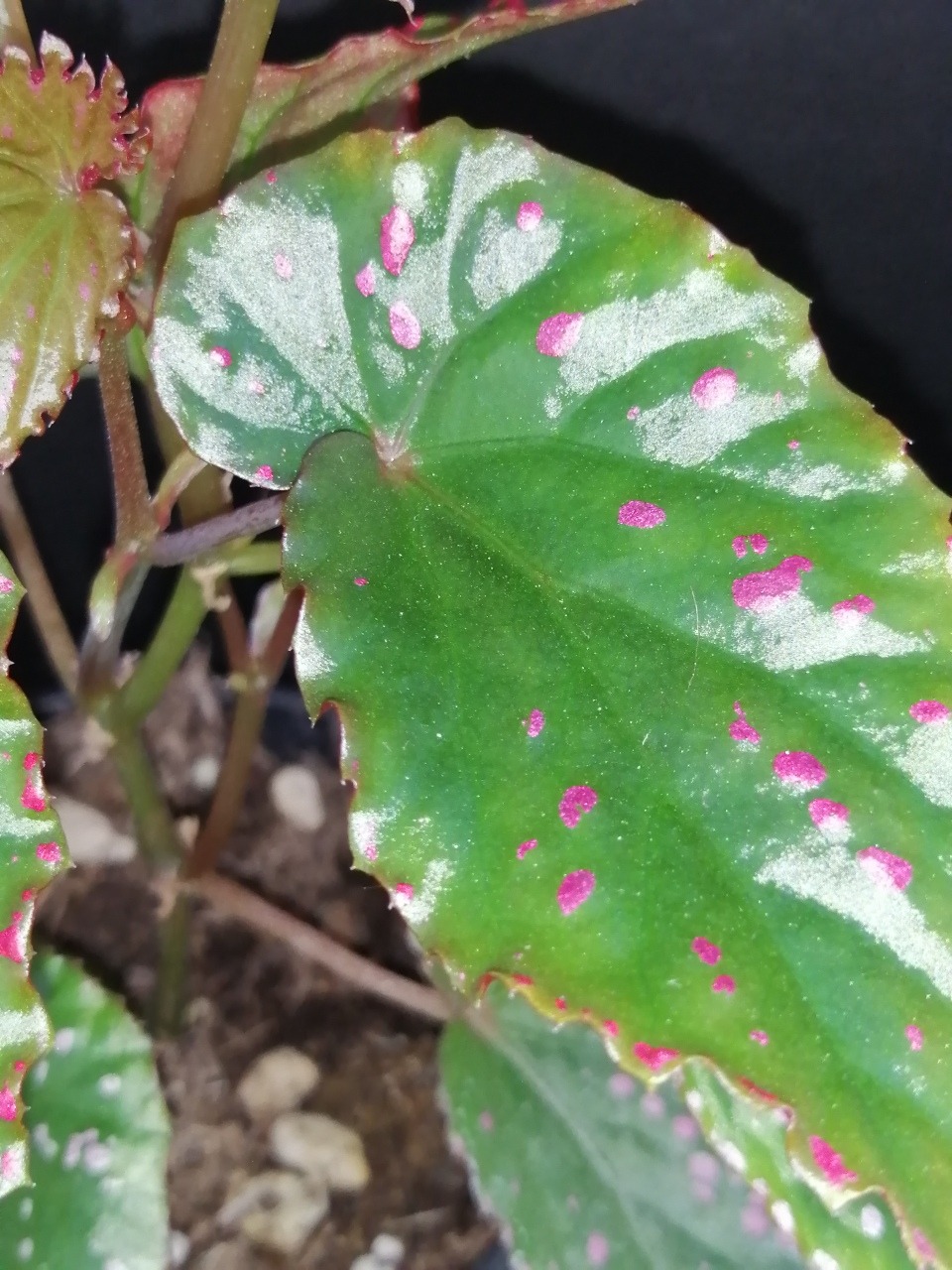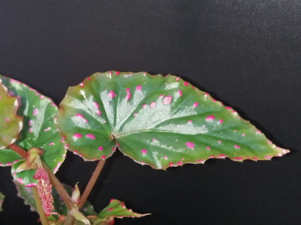 Begonia negroensis : spettacolare begonia che forma un piccolo cespuglio di circa 30cm di altezza, dal fogliame nero con macchie e puntini rosa carico. I colori si intensificano con l’aumentare della luce.