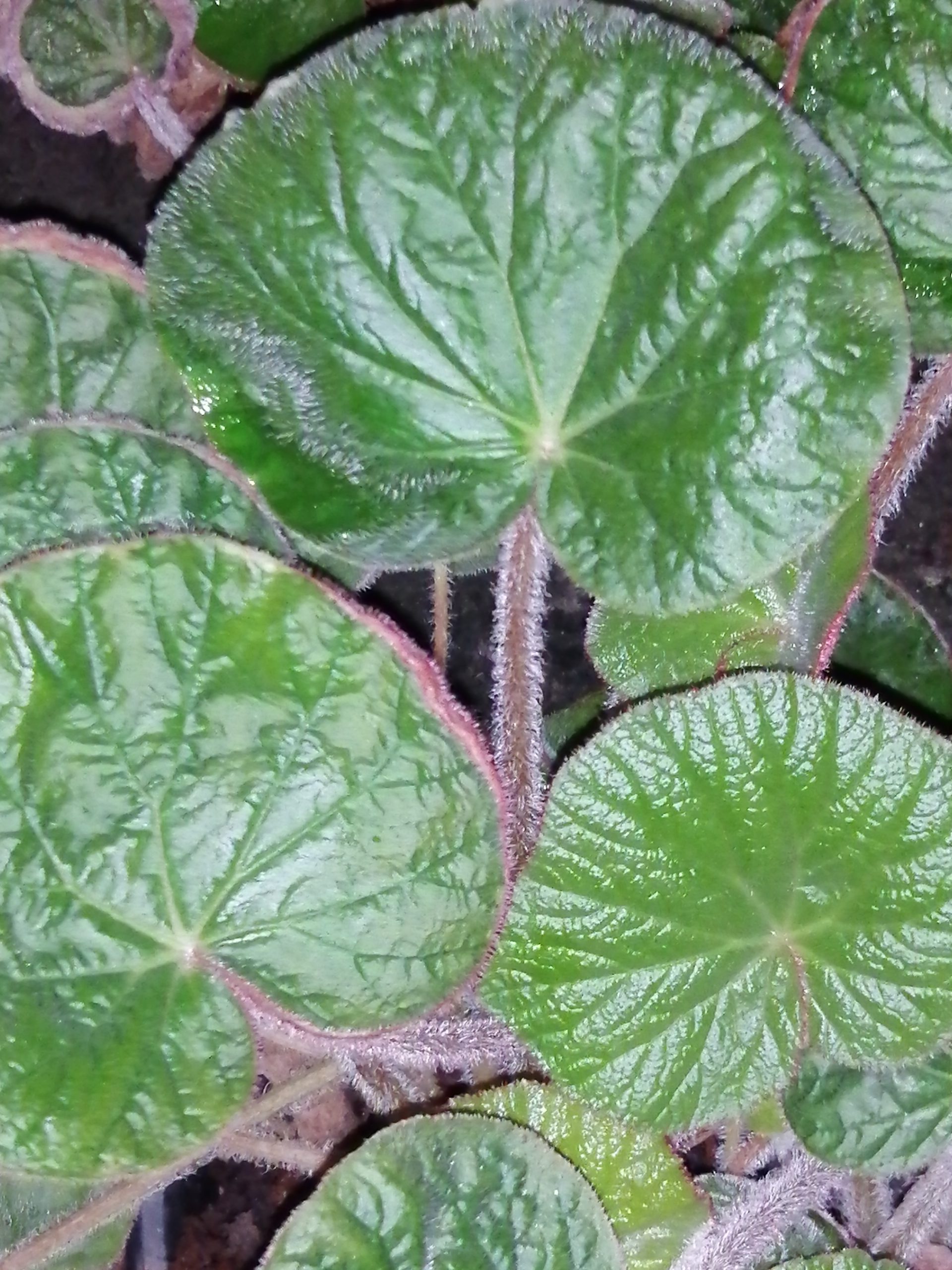 Rizomatosa dalle grandi foglie tondeggianti, vellutate al tatto, verdi con corta peluria rosata.