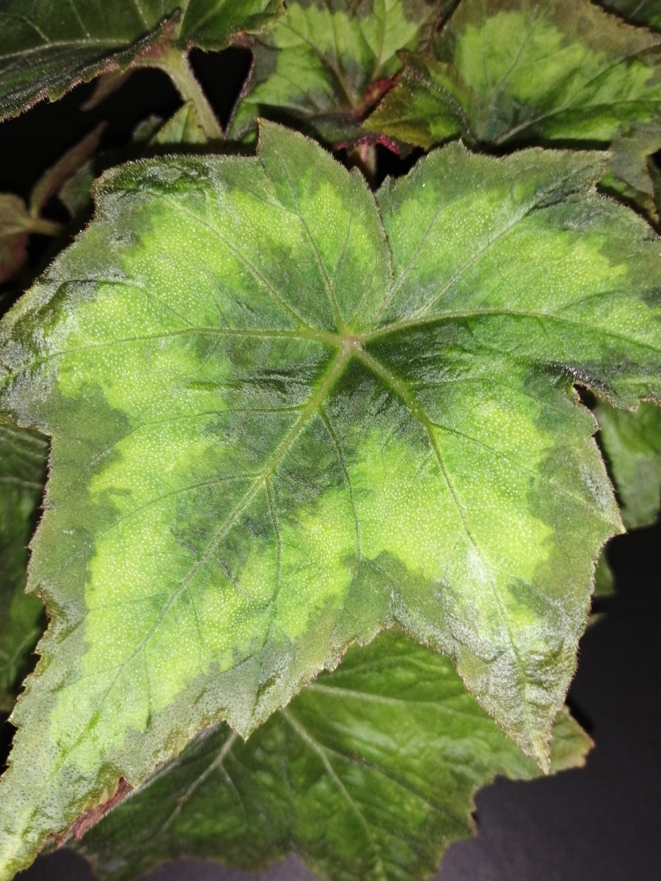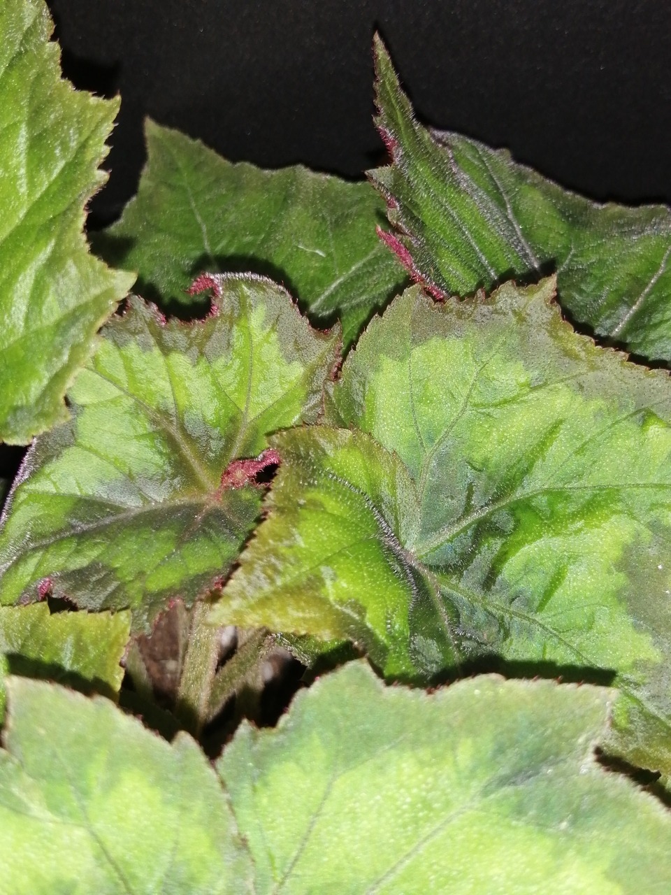 Splendide foglie grandi e profondamente incise, elegantissime, verde chiaro vellutato con zonature verde lime e argento.