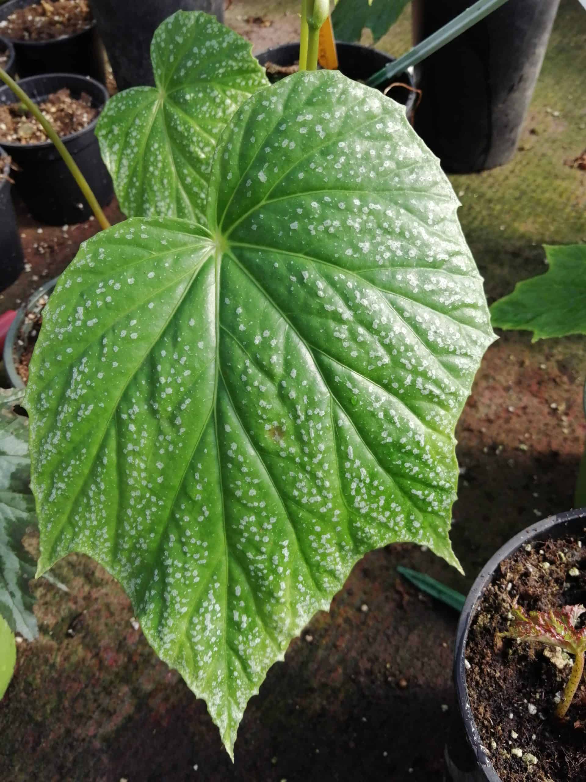 Questa Begonia ha grandi foglie asimmetriche che possono raggiungere i 30cm di lunghezza, verde oliva macchiate di bianco argento. I fiori sono bianchi, portati su steli alti che crescono al di sopra delle foglie. Il cespuglio morbido e aperto, raggiunge i 60cm di altezza.