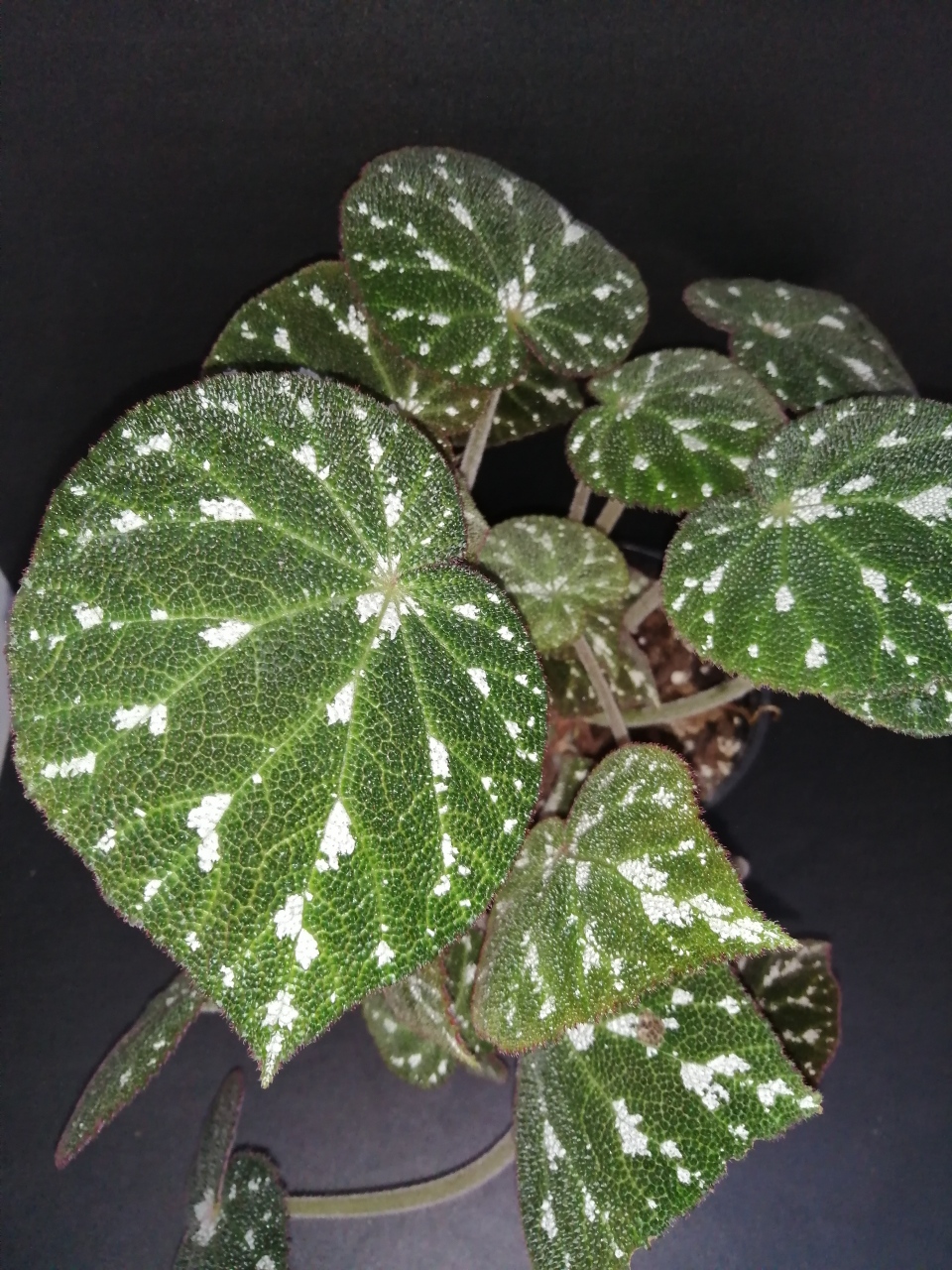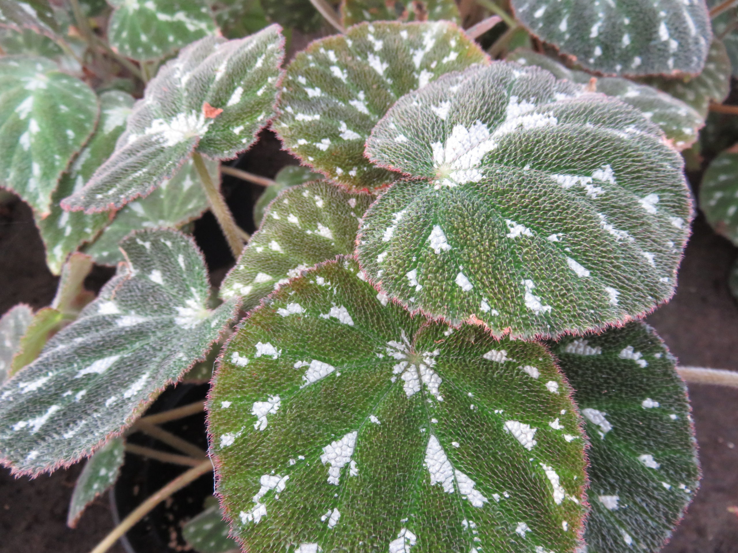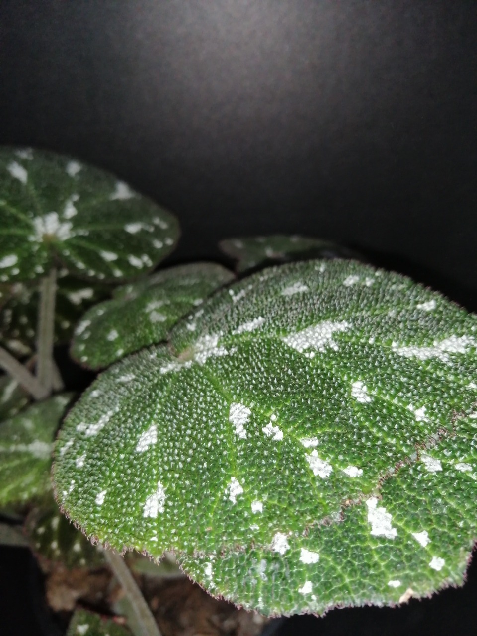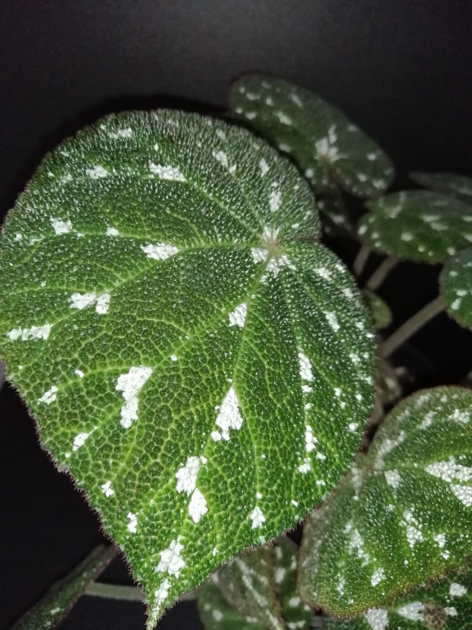 Forma un rizoma strisciante da cui nascono le numerose foglie, vellutate, verde scurissimo con venature e macchie argentee. La superficie è molto particolare, rugosa e pustulata.