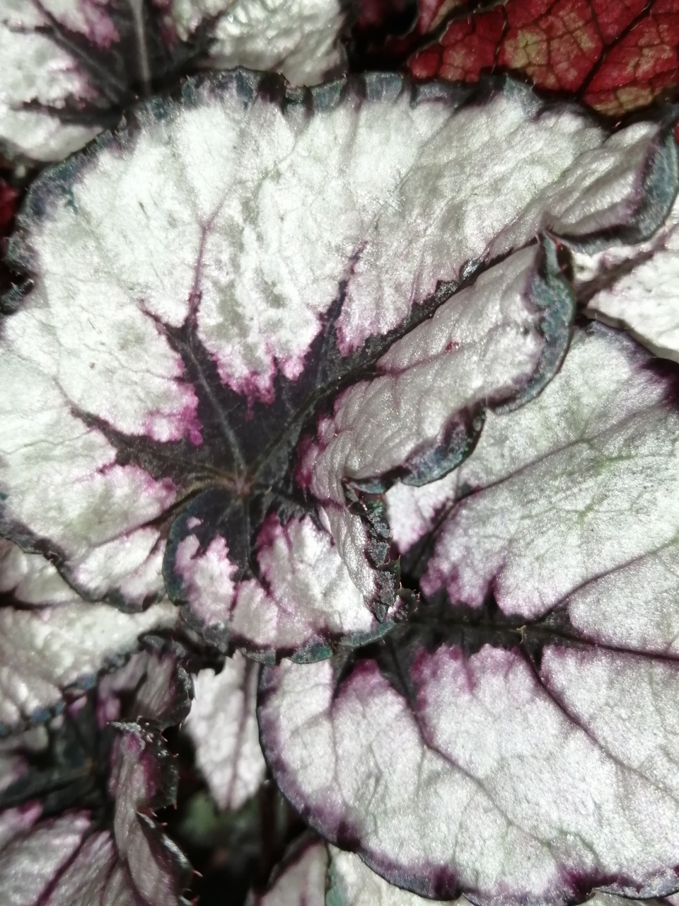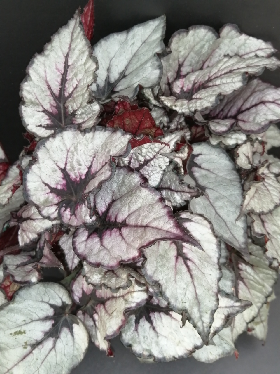 Grandi foglie argento vivo  con grande zonatura scura  e poi rosa che segue la forma della foglia. Nervature molto scure, quasi nere, bordi arricciati.