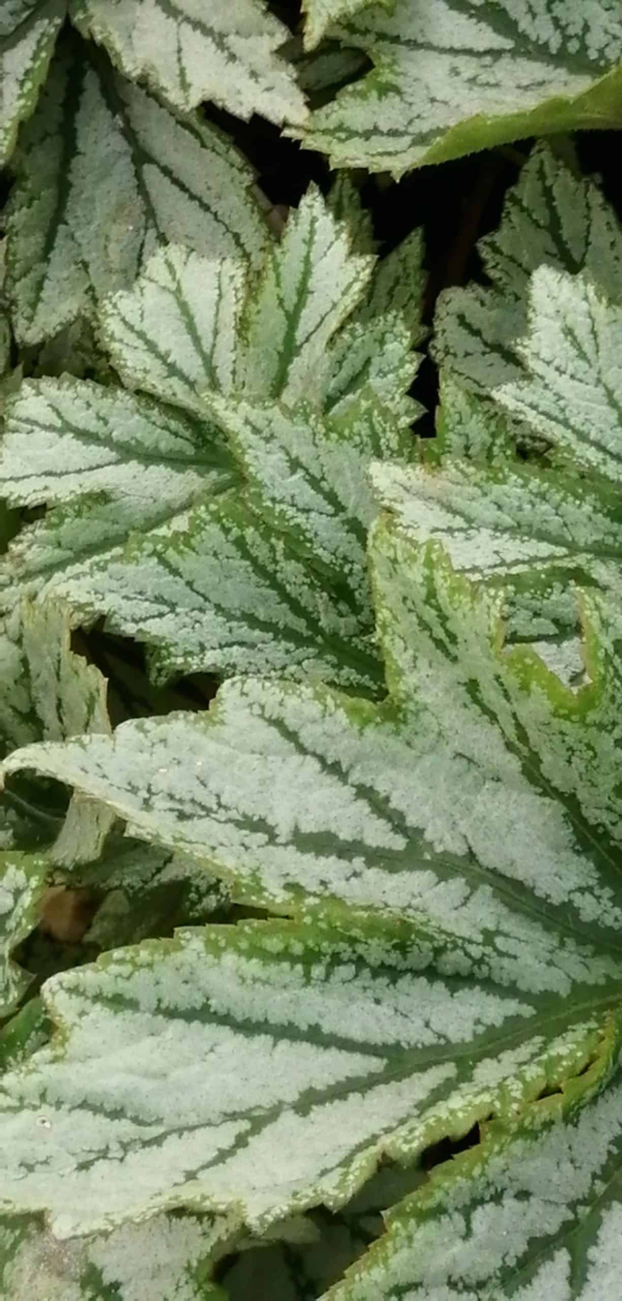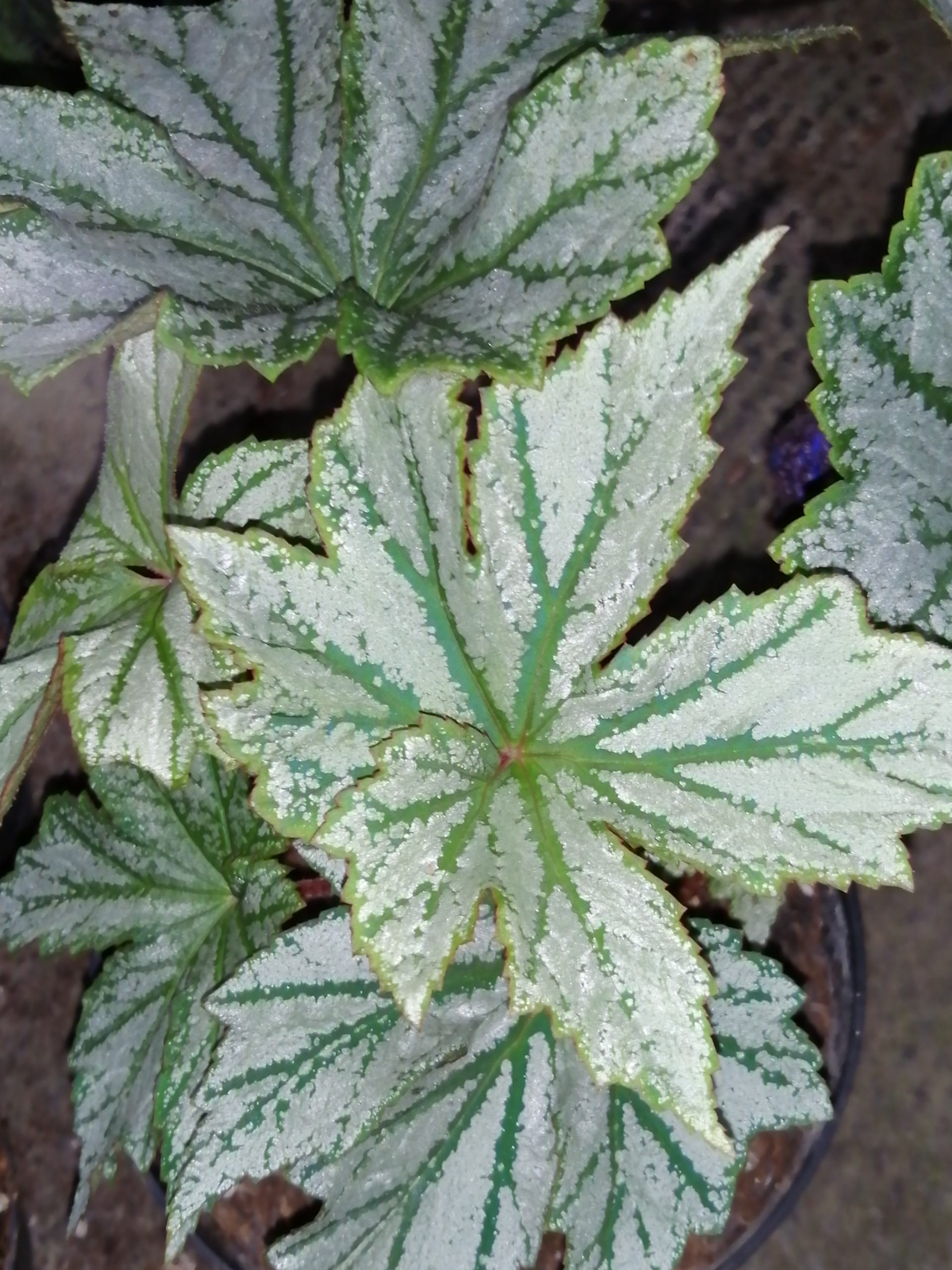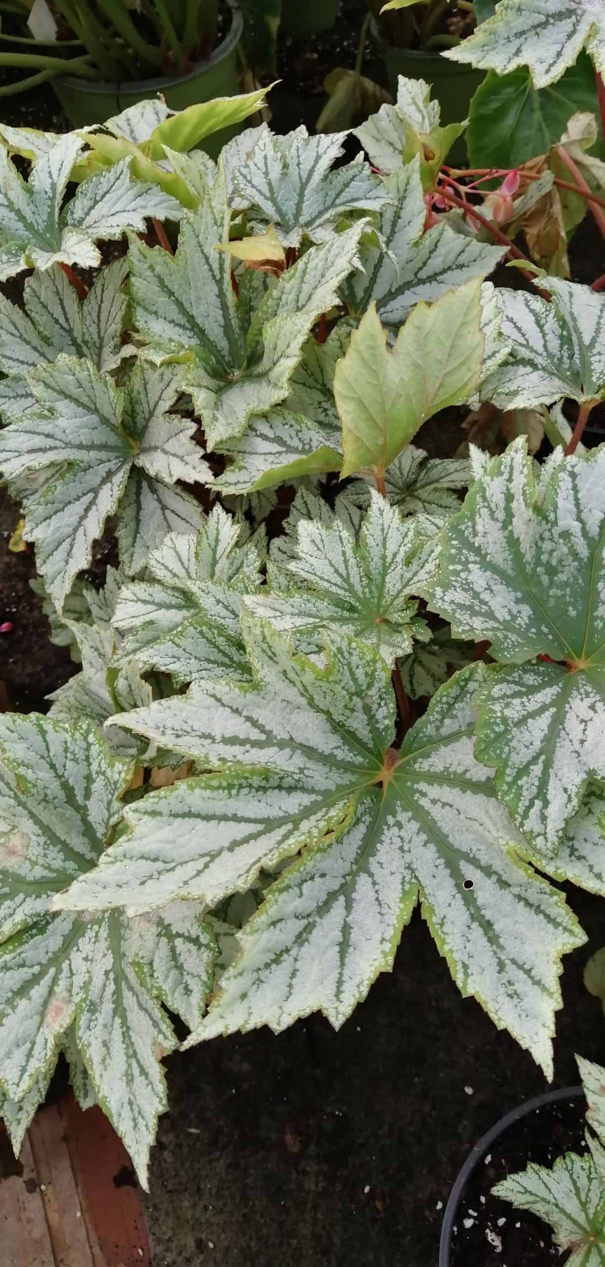 Questa begonia ha foglie palmate di medie dimensioni, grigio argentee di grande effetto estetico.