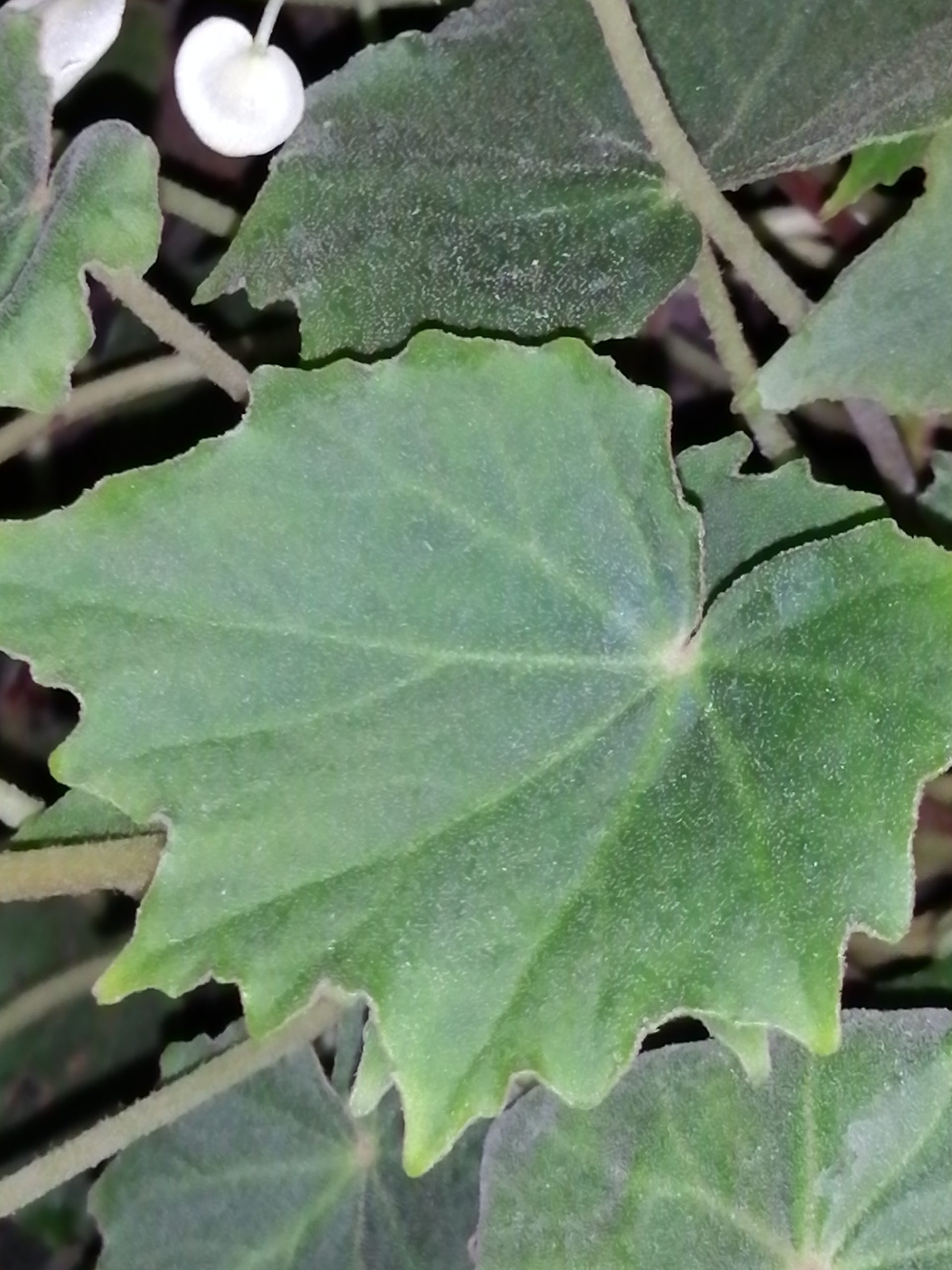 Begonia non classificata, a foglie grigie, coperte da leggera e corta peluria. Pianta a portamento compatto ed ordinato. Fiori bianchi in autunno-inverno.