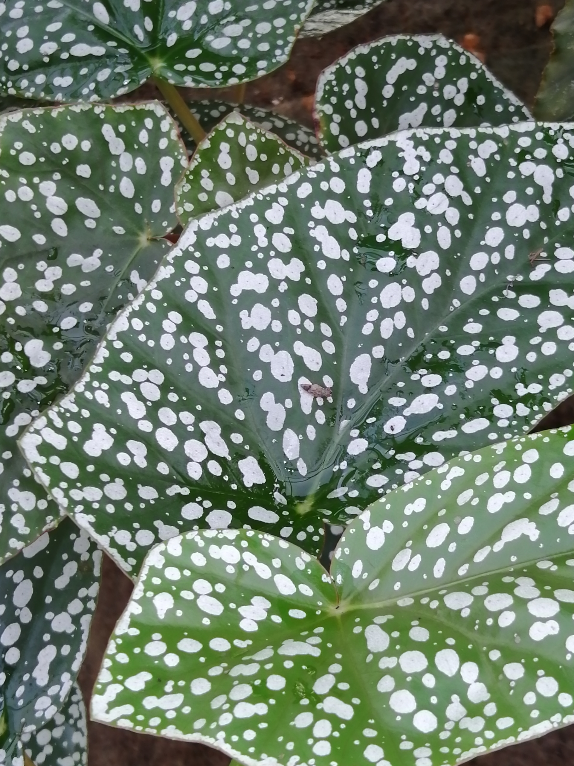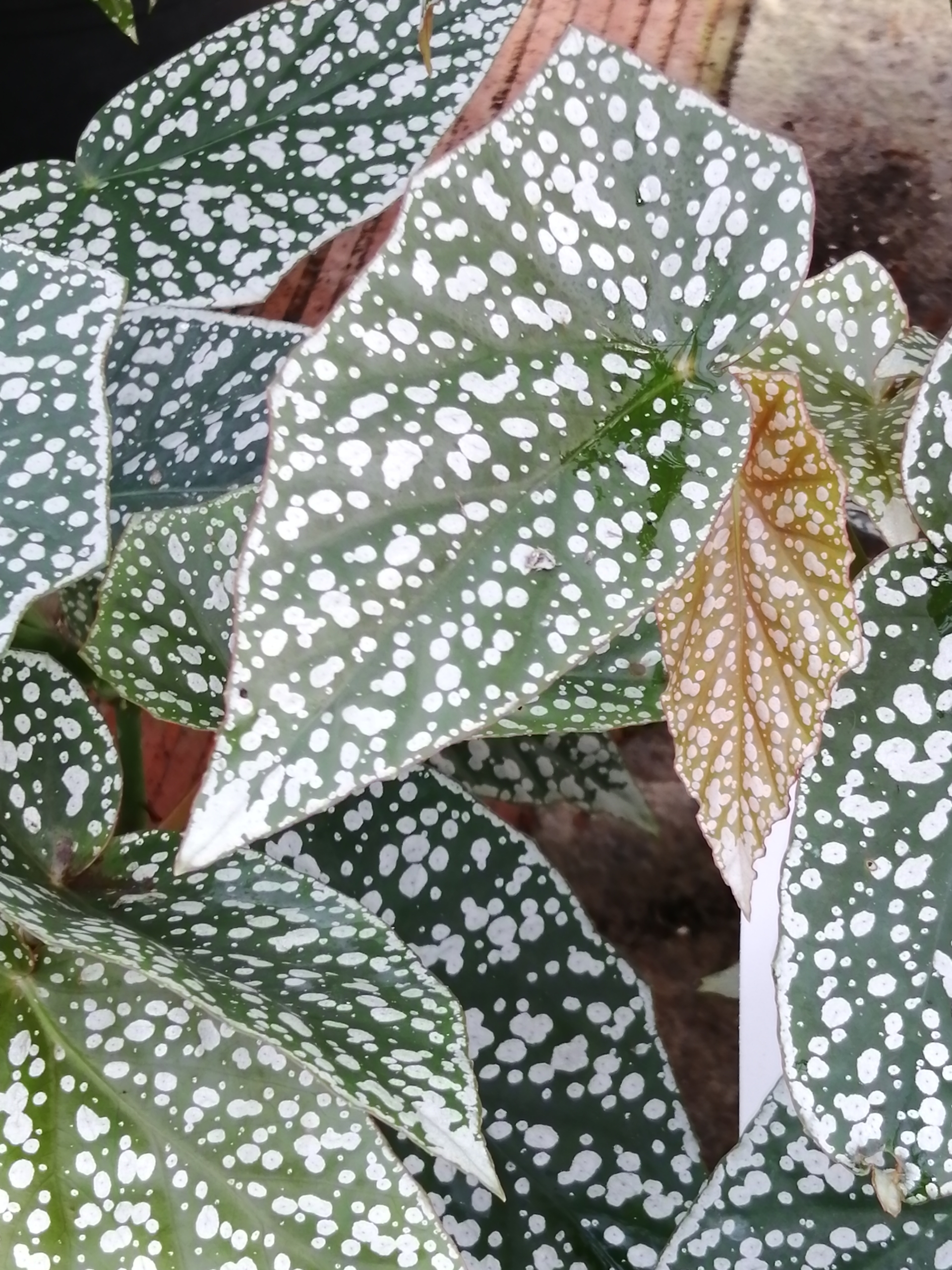 Eppure mantiene inalterato il suo grande fascino. Ha grandi foglie ad ala d’angelo, verde scuro con margini e macchie estese bianco ghiaccio che creano un contrasto di rara suggestione.
