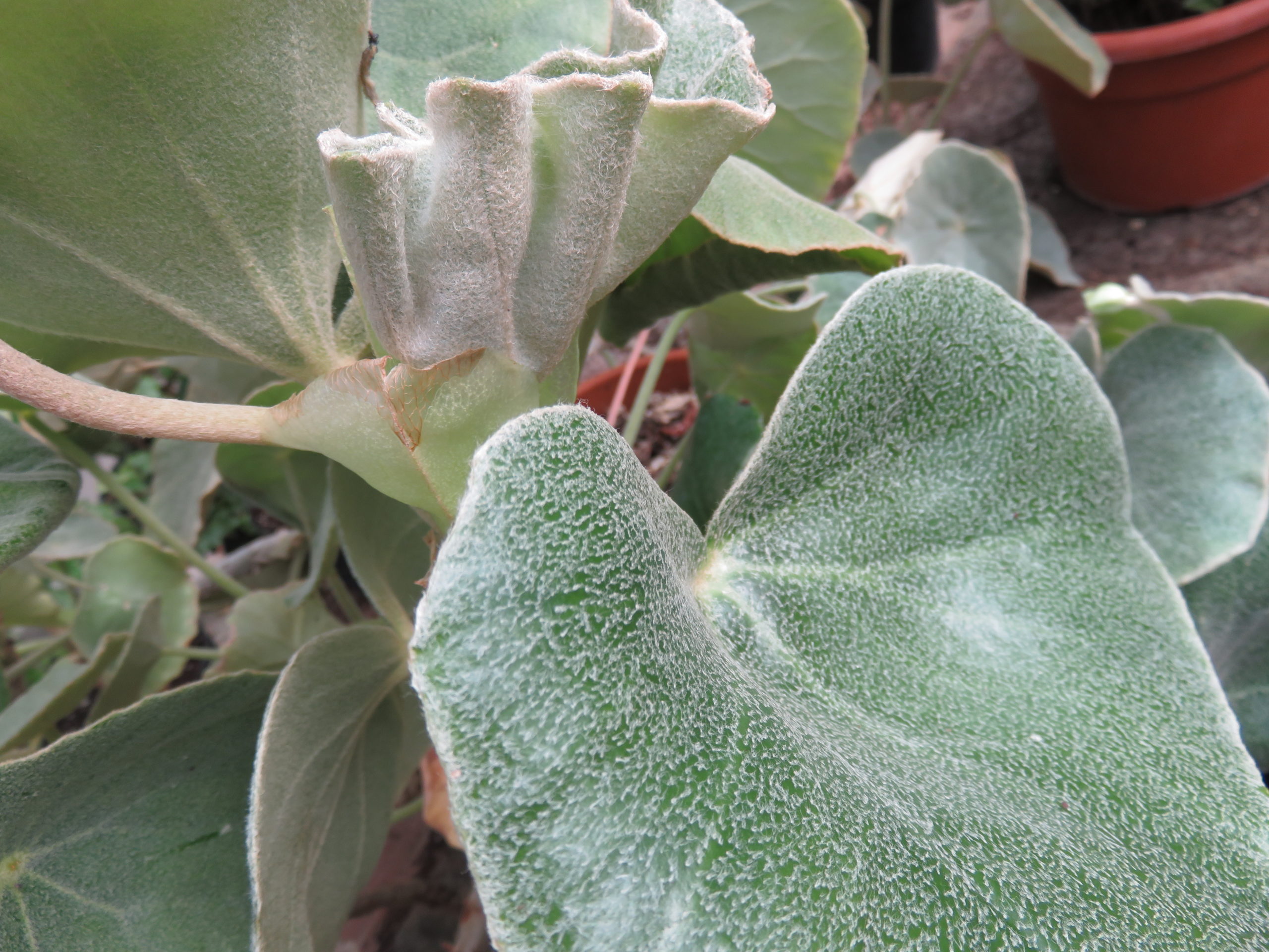 Begonia venosa, Chiamata anche Elephant, per via delle grandi foglie tondeggianti e carnose, che ricordano le orecchie di elefante. E’ una specie brasiliana, a lenta crescita, caratterizzata dalle foglie spesse e coperte di peluria bianca, fiori bianchi. Richiede innaffiature molto moderate.