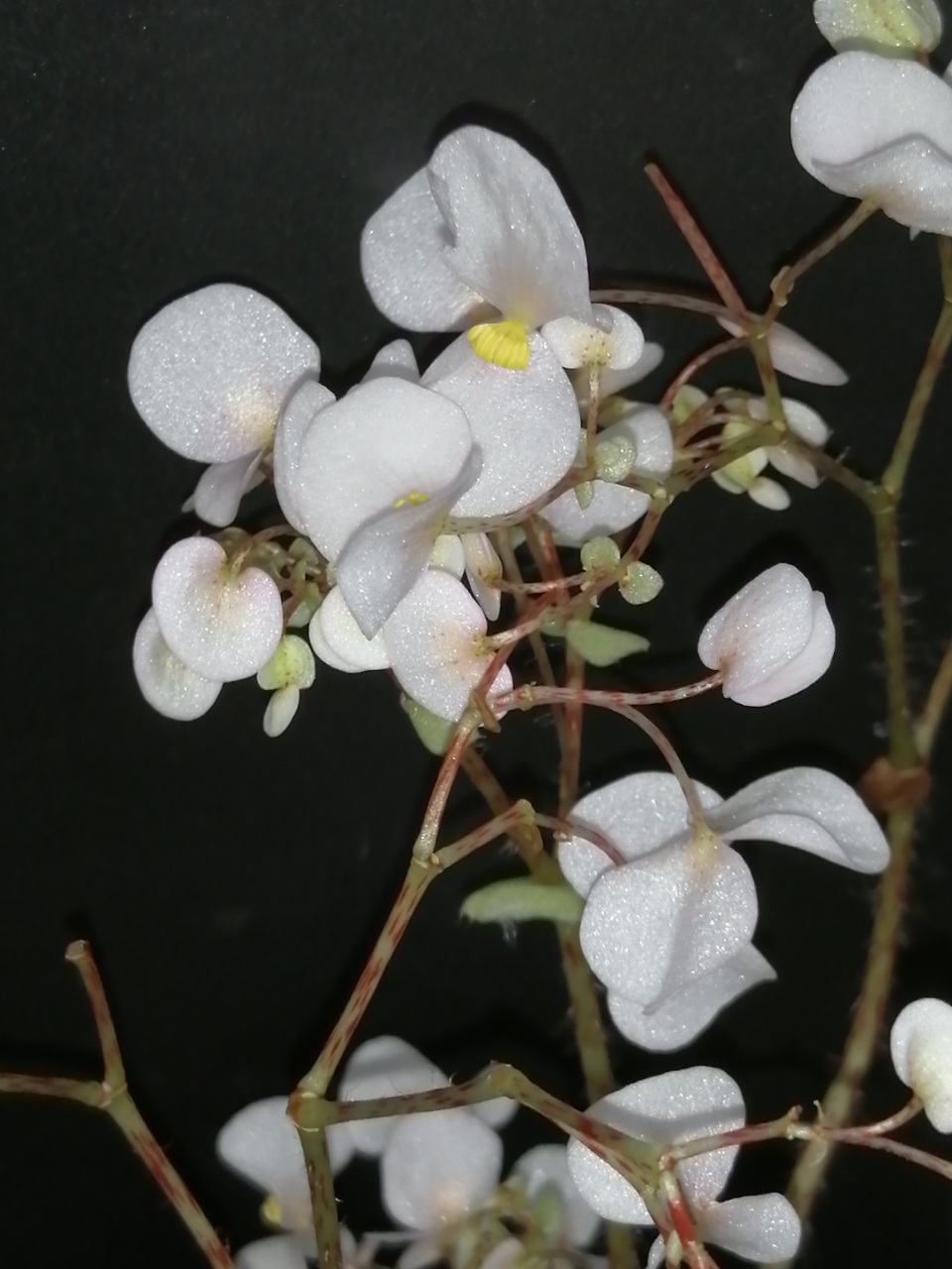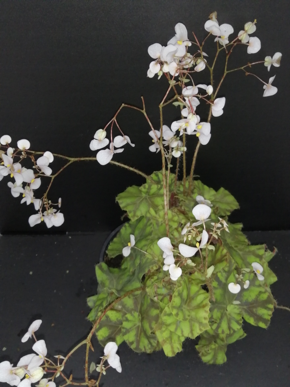 Nuova varietà di Begonia rizomatosa a portamento compatto ed ordinato. Foglie medie verde chartreuse macchiate di scuro, spiraliformi. ottima fioritura bianco rosata a febbraio-aprile.