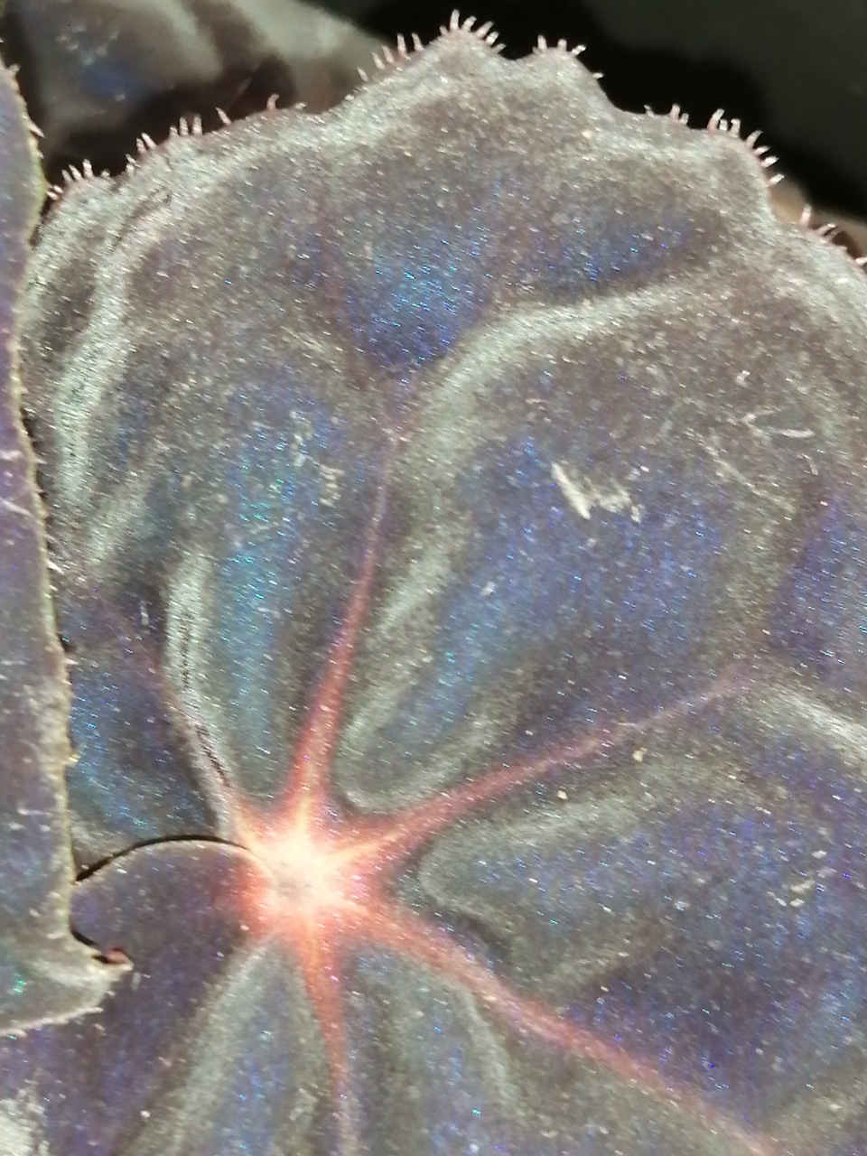 Foglie di un intenso nero, tondeggianti, vellutate, con centro aranciato.