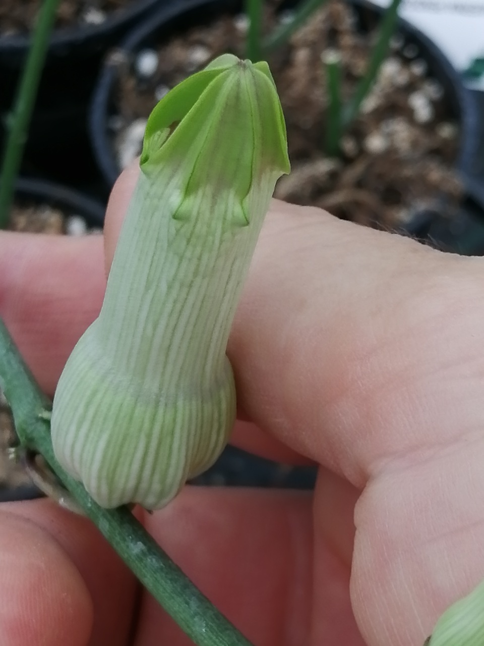 Ceropegia ampliata è conosciuta come ‘Bushman’s Pipe’ ; è una pianta rampicante o ricadente dalle foglie rade, lanceolate, sottili, verde chiaro. Gli steli sono lisci rampicanti e difficilmente ramificano. I fiori sono spettacolari, e raggiungono i 7cm di lunghezza. Sbocciano a fine estate.