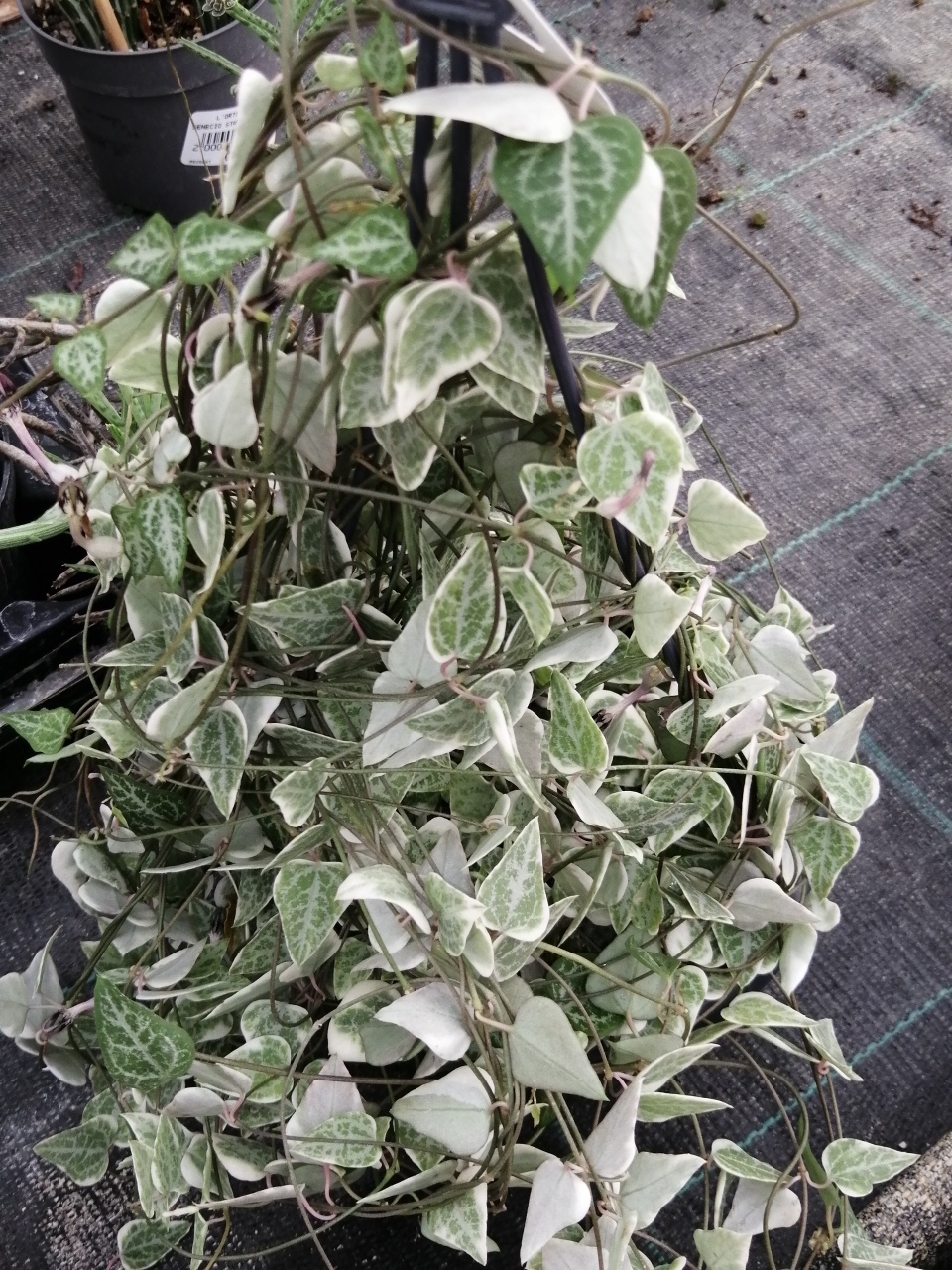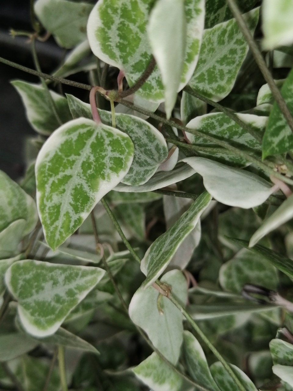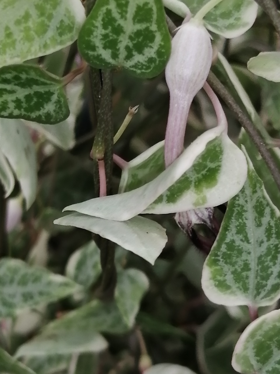 Ceropegia linearis subs. woodii Merel è una nuova selezione. Le foglie sono a cuore, verde chiaro, con margine e puntinature color crema.