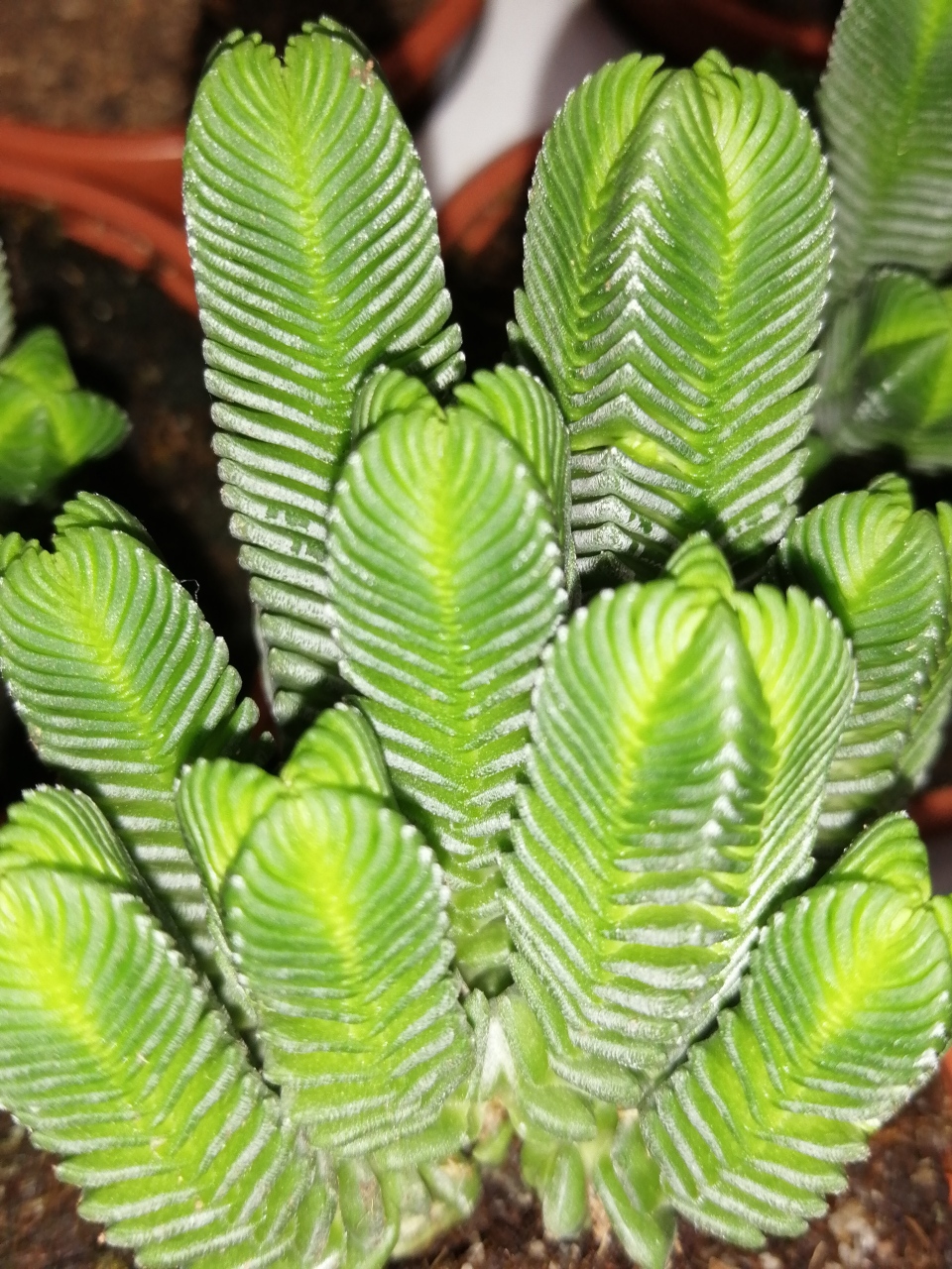 Crassula Buddha’s Temple . Piccola deliziosa crassulacea dalle foglie carnose, verdi che formano una rosetta, quadrangolare. Delicati fiorellini bianchi rosati in profusione.