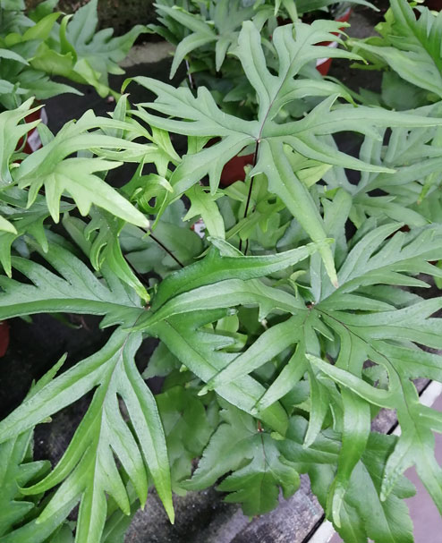 Ha un portamento compatto e non supera i 30cm di altezza. Le foglie sono verde scuro, lucide, palmate e portate su lunghi steli neri.