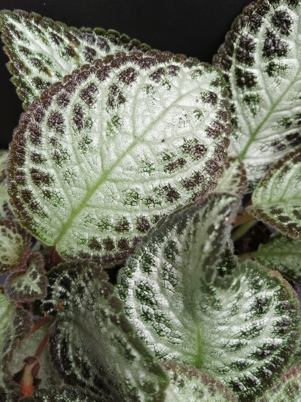 Gesneriacea di origine americana, dalle foglie molto particolari, soffici, argento caldo con margini scuri, rame e bronzo. Fiori rossi.
