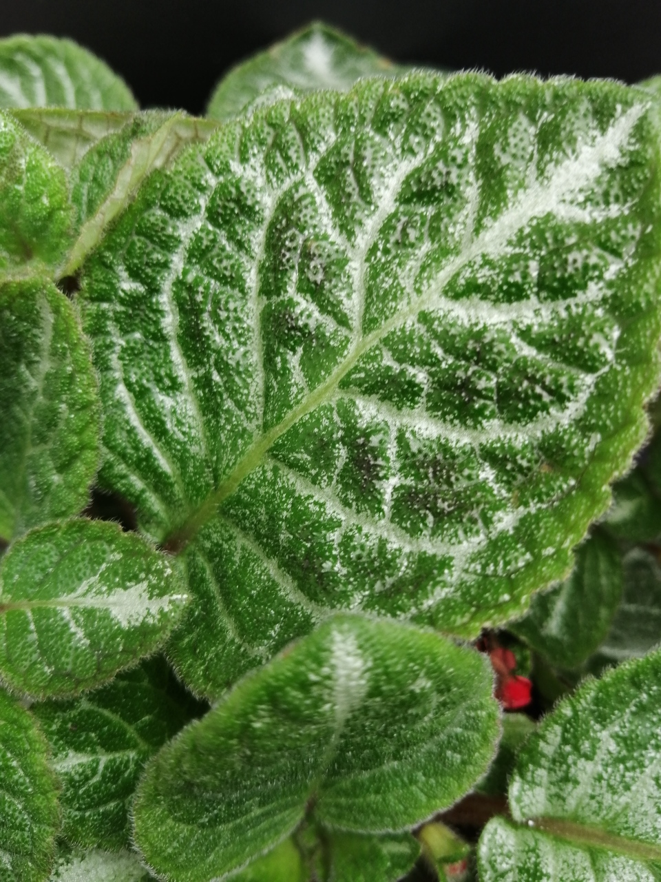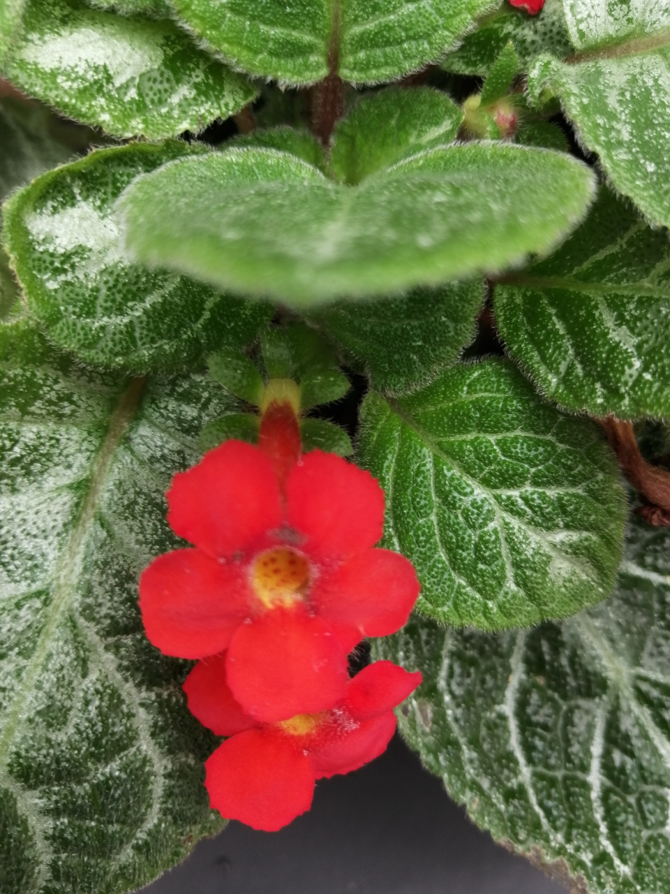 Gesneriacea di origine americana, dalle foglie molto particolari, soffici, verde smeraldo con venature centrali argentee. Fiori rossi.