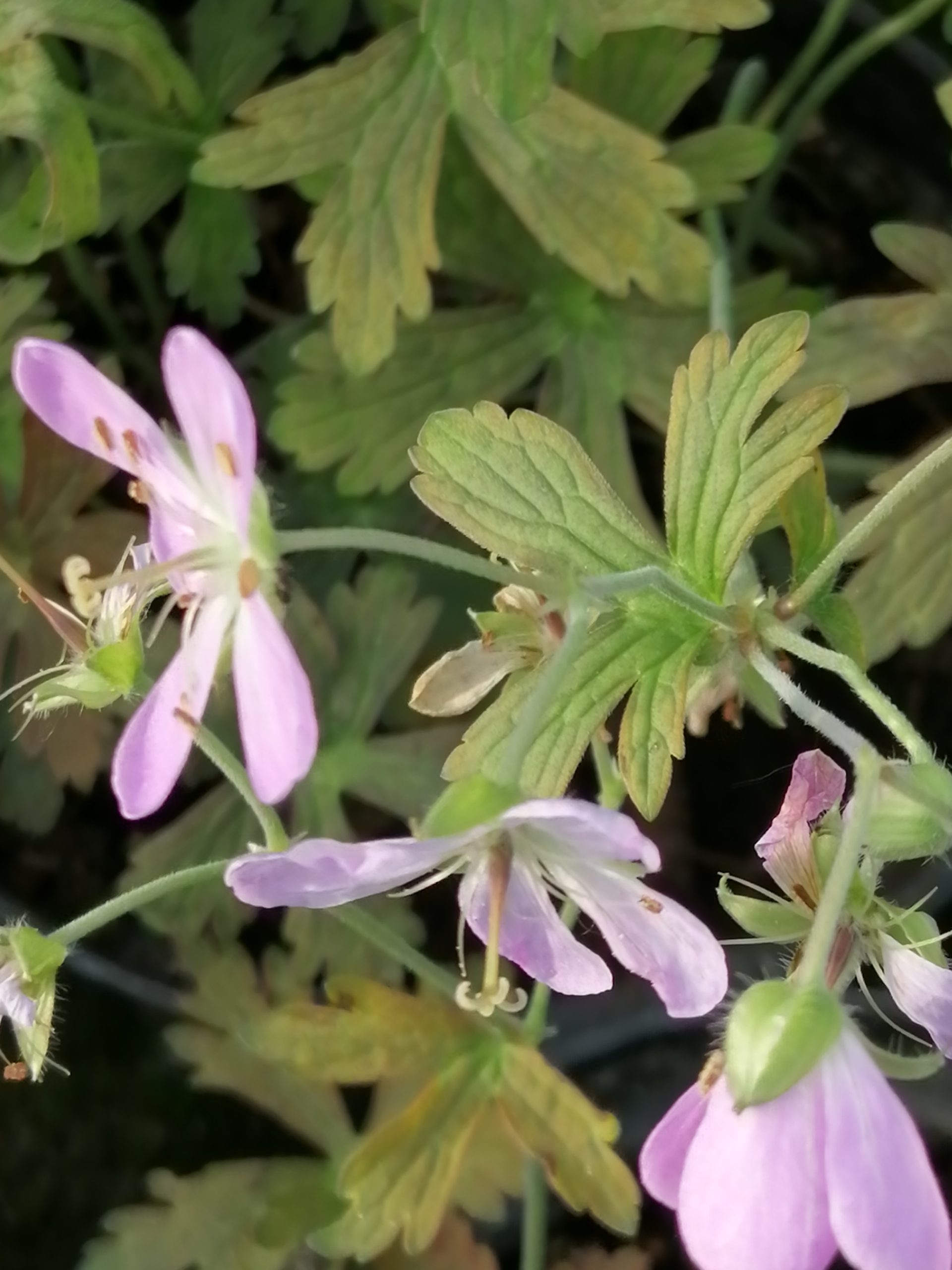 Perenne, rustico. Questo Geranium produce fiori lilla azzurrino che si schiudono numerosi sul folto delle foglie palmate di un particolare verde bronzeo marroncino creando un effetto cromatico molto interessante.