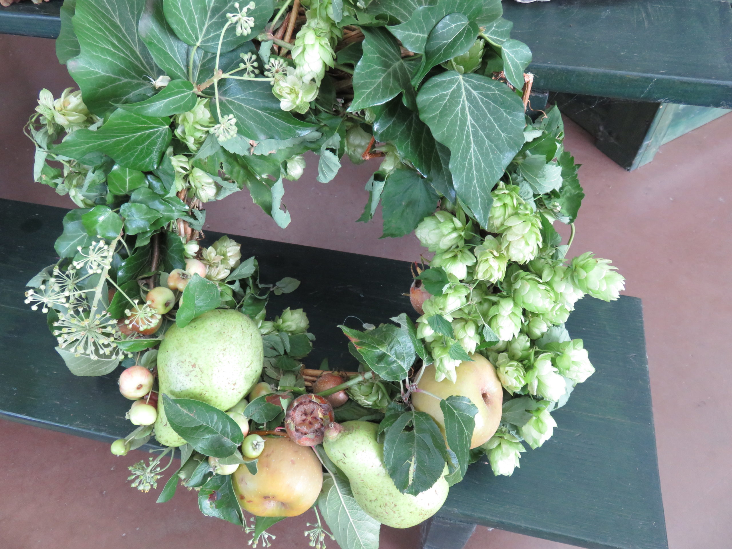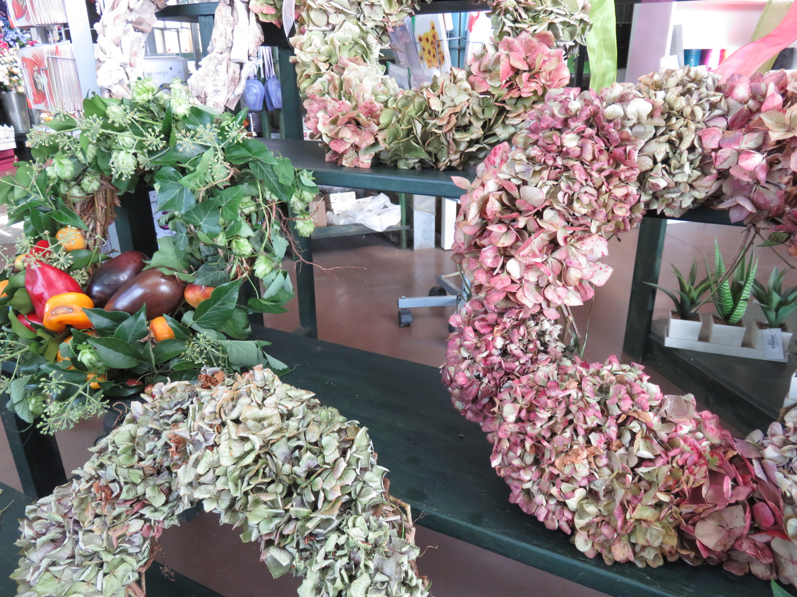 Proponiamo ghirlande con fiori e frutti stagionali, per impreziosire ingressi, portoni e mobili.