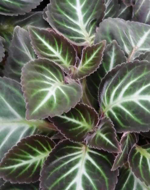 Il fogliame è verde sfumato di bronzo, soffice e vellutato al tatto. I fiori sono lilla porpora.