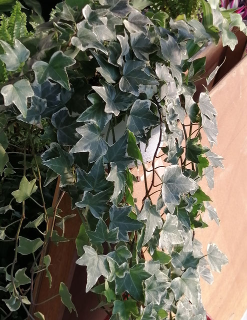 Hedera helix Glacier e’ una graziosa erbacea rustica, perenne sempreverde, dal fogliame medio piccolo, verde grigio, variegato di bianco crema.