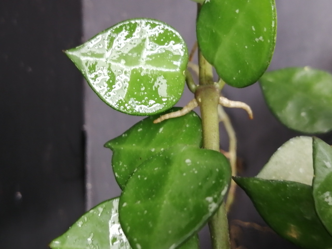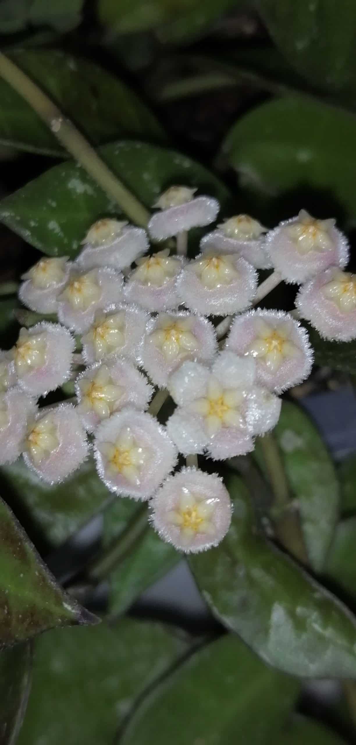 Rara Hoya a fiore bianco profumatissimo. Foglie marezzate di bianco crema, venature ben in vista.