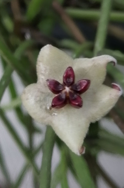 Hoya retusa Appartiene alla grande famiglia delle piante chiamate ‘fiori di cera’. Questa specie ha foglie molto particolari, filiformi, allungate e carnose. Il portamento è ricadente. i fiori sono bianchi con corona rosso scuro, delicatamente profumati.