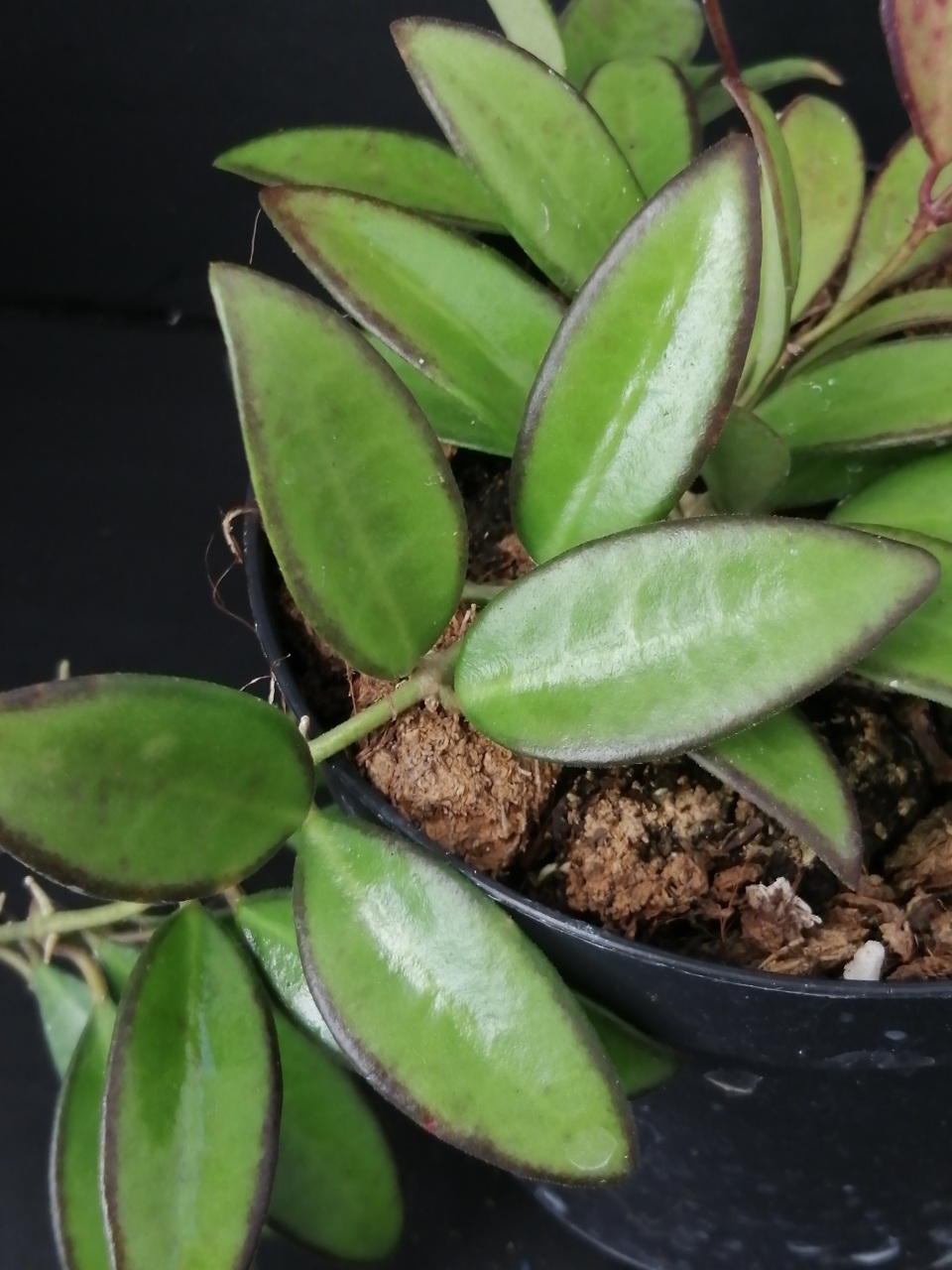 Hoya Rosita, ibrido di H. wayetii x H. tsangii. Ha foglie carnose, allungate con margine scuro. I fiori rosa rosso sono prodotti a lungo durante tutto l’anno.