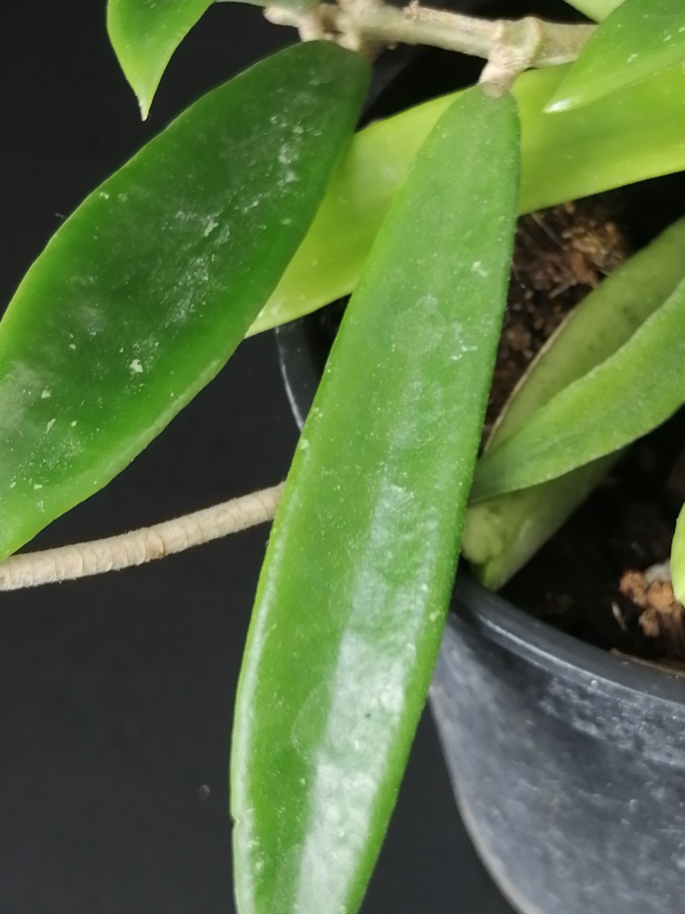 Interessante di Hoya originaria di Tailandia ed Est India. Ha foglie sottili allungate, carnose, verde intenso.