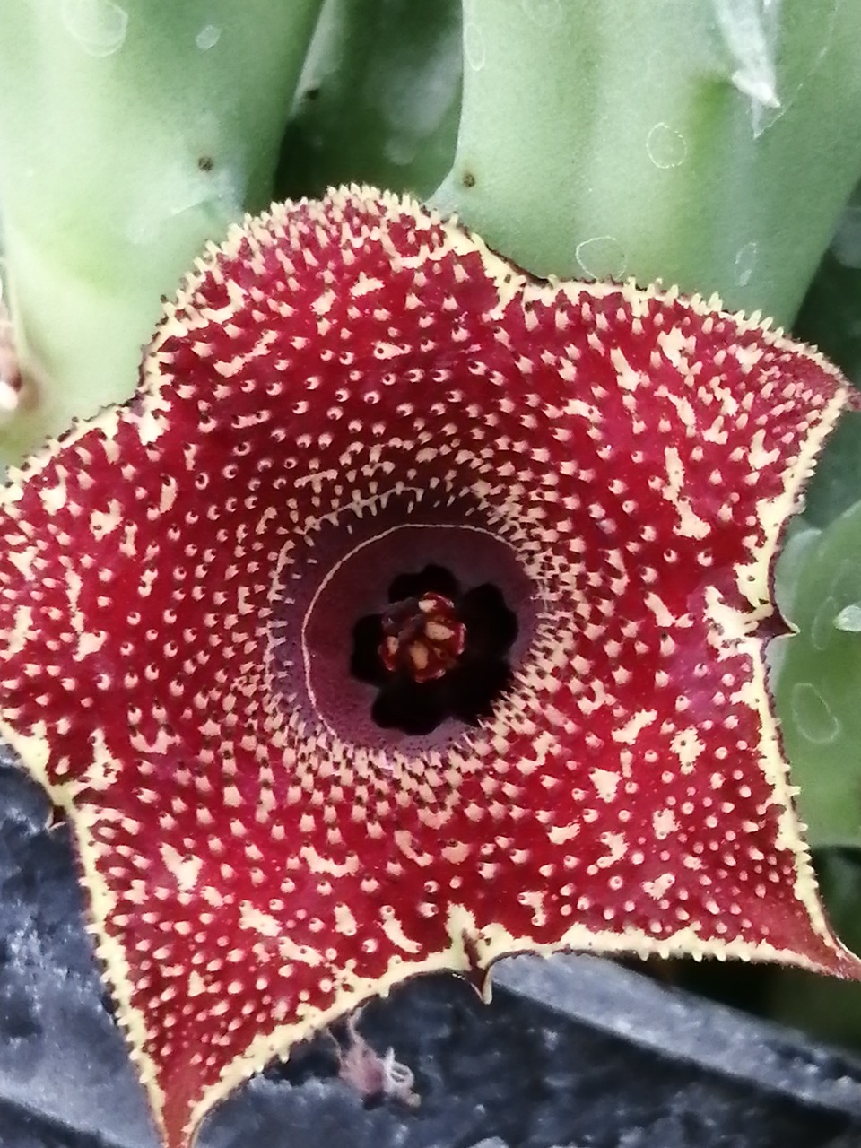 Huernia hybrid orto 1 Recente selezione a fiori grandi, a stella con interessanti puntinature giallo oro su sfondo cremisi scuro. Margine giallo oro.