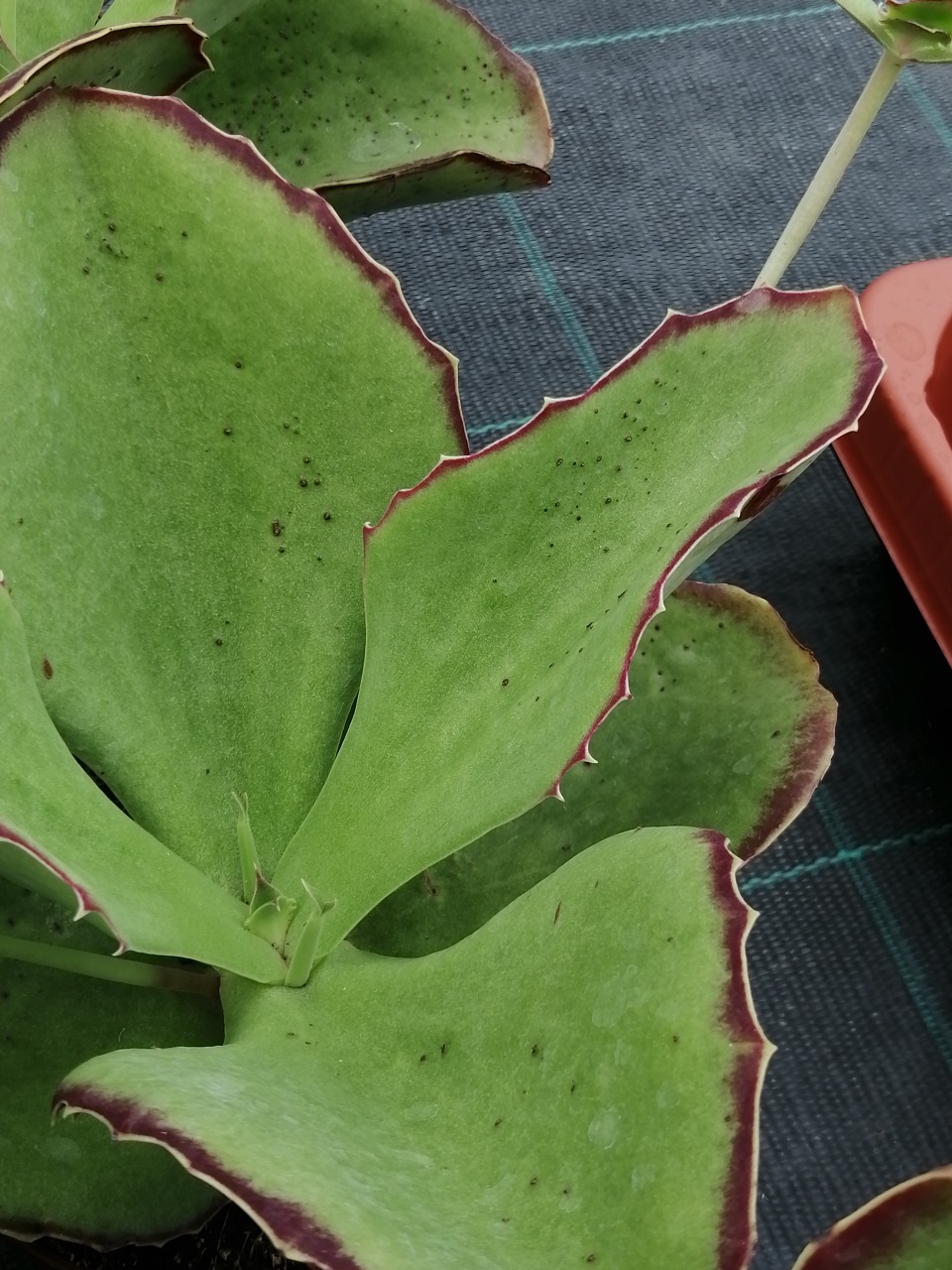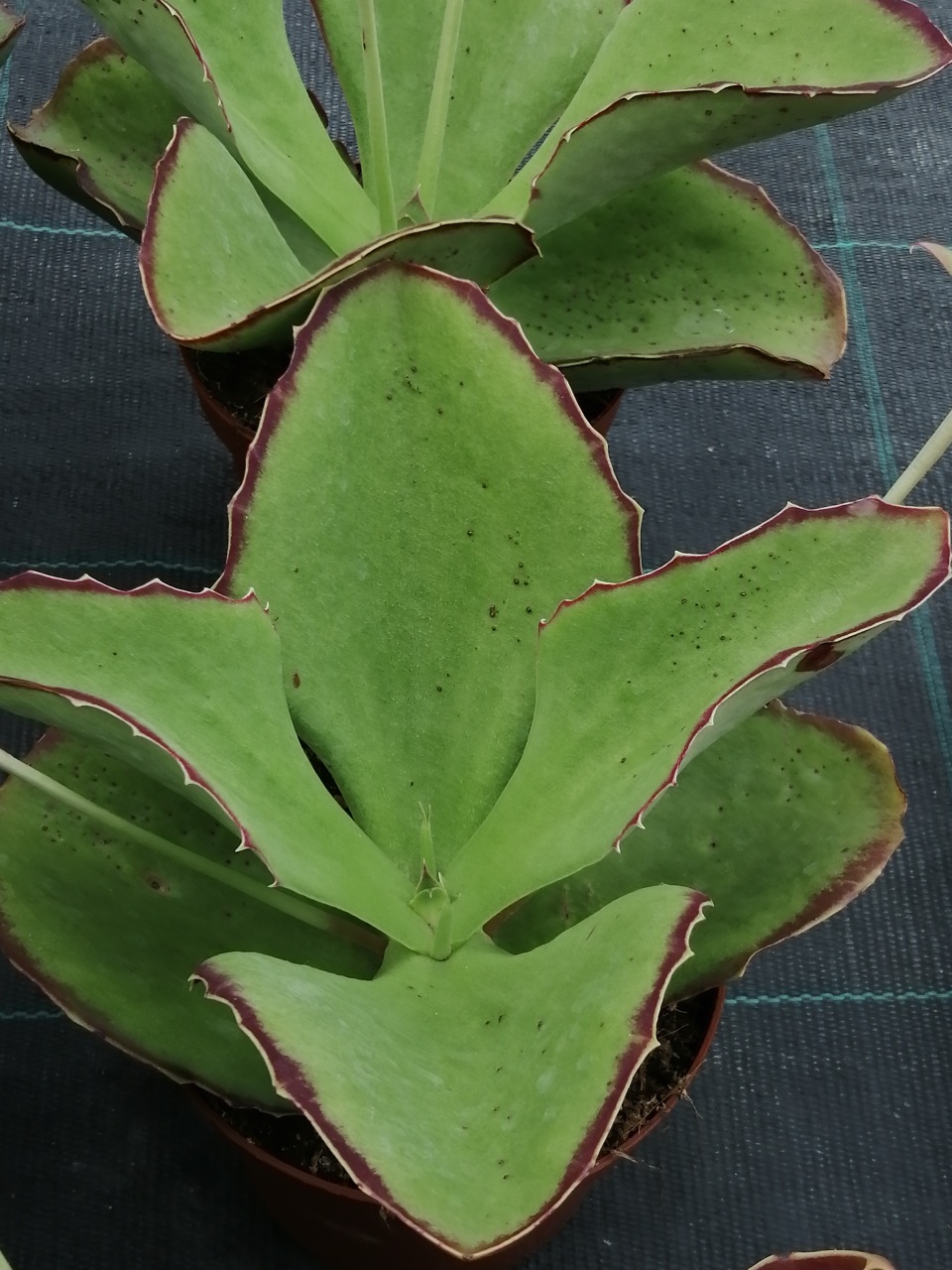 Kalanchoe synsepala : Crassulacea originaria del Madagascar. Produce foglie grandi, carnose, verde chiaro con bordi marroncini e dentati.
