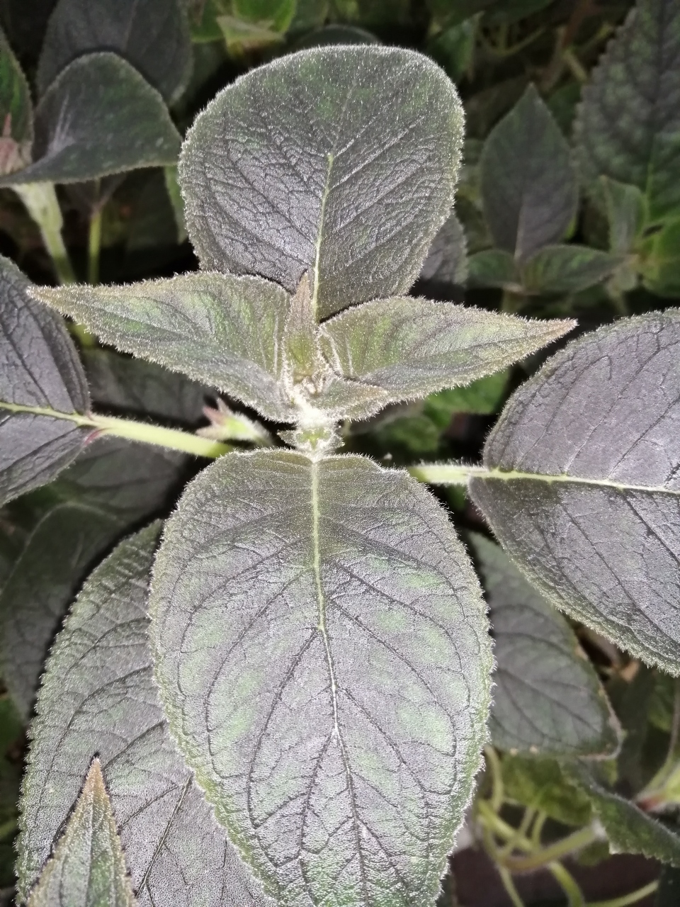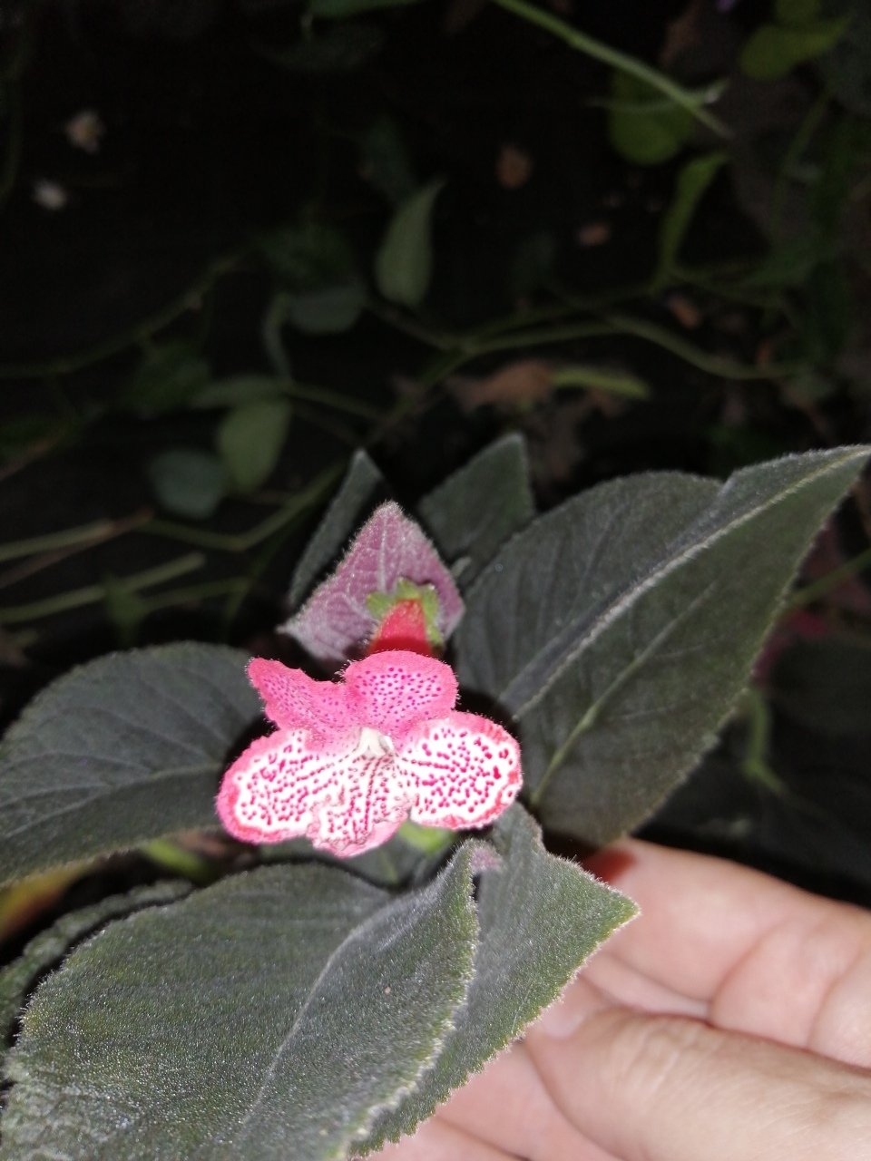 Ha delicate foglie vellutate verde mogano e fiori rosso fragola con puntinature bianche.
