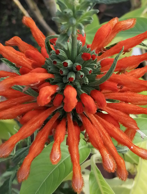 Leonotis leonurus . Splendido arbusto a crescita veloce, semirustico. A fine estate -autunno sbocciano appariscenti fiori arancio vivo, raccolti in una grande infiorescenza.