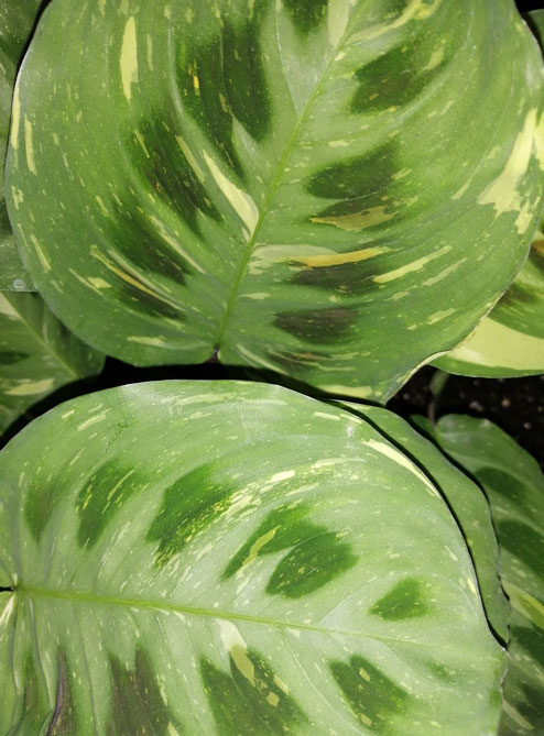 La marantha leuconeura var. kerkoveana Variegata ha fogliame molto ornamentale: la variegatura gialla caratterizza questa selezione che ama luce indiretta e tollera anche la luce scarsa.
