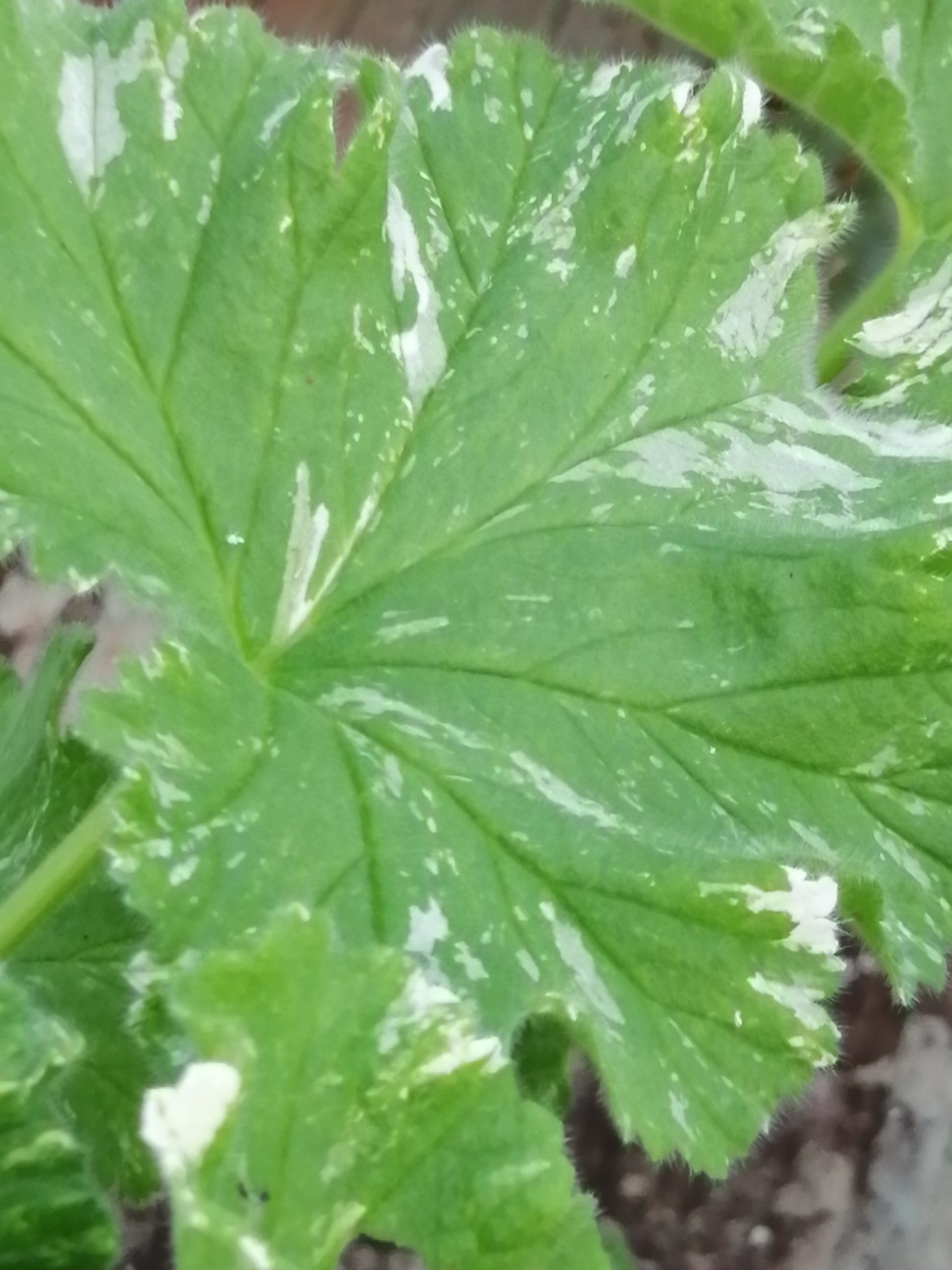 il Pelargonium Both’s Snowflake è una pianta a crescita vigorosa. Le grandi foglie trilobate sono verde chiaro screziate di bianco.  il profumo di rosa e limone è molto forte.