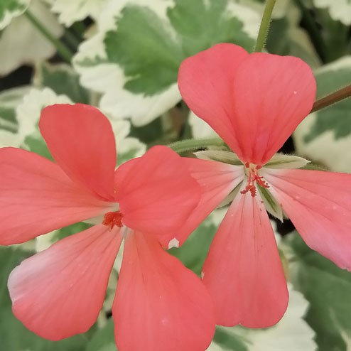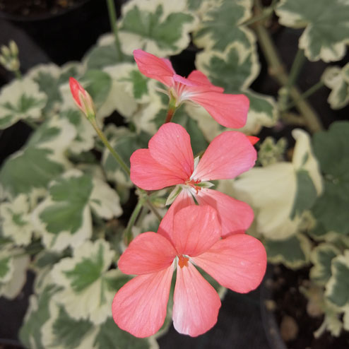 Pelargonium dalla forma compatta e dalle foglie verde chiaro marginate e orlate di crema.