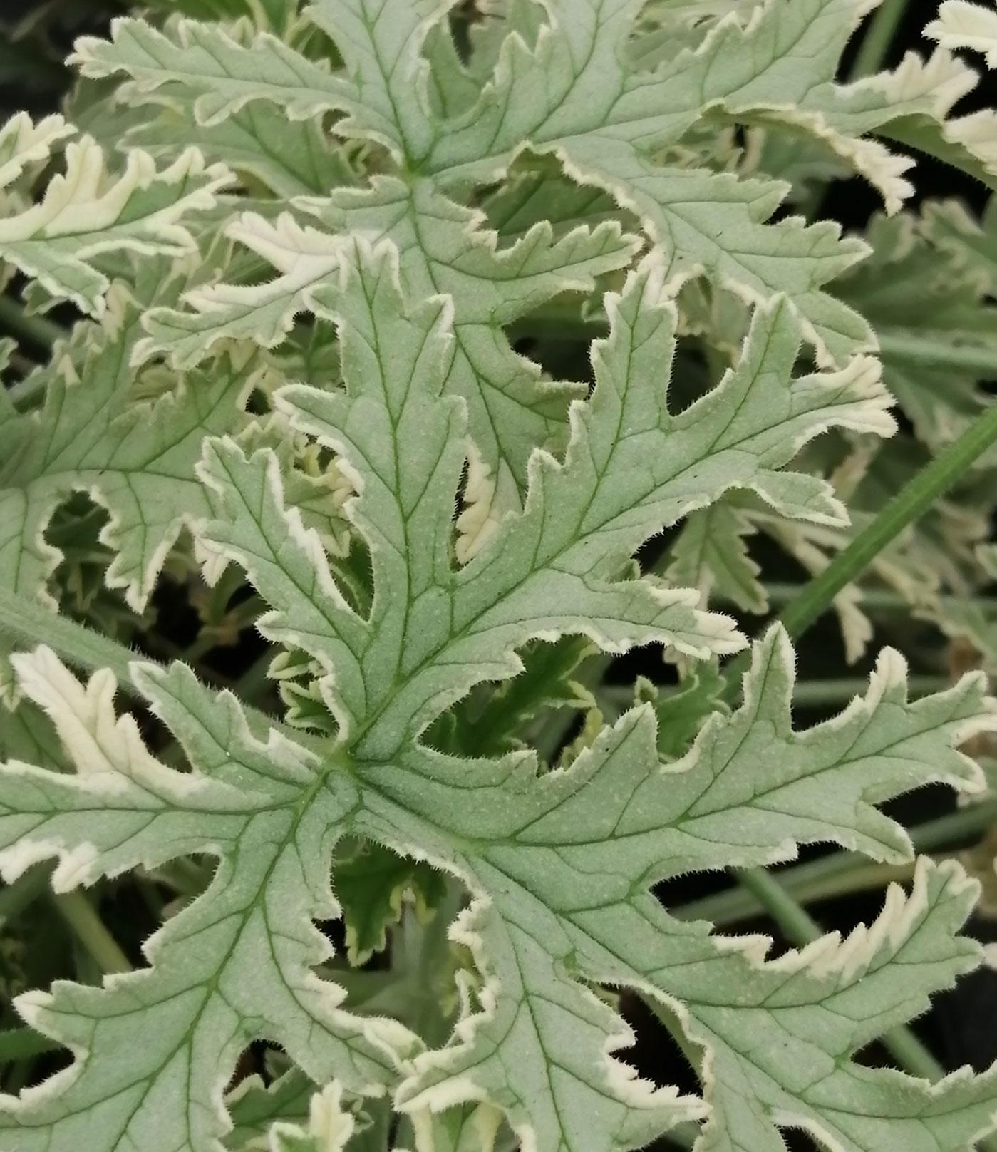 è una nuova selezione di geranio odoroso dalle foglie incise e variegate di giallo crema profumate di menta limone.