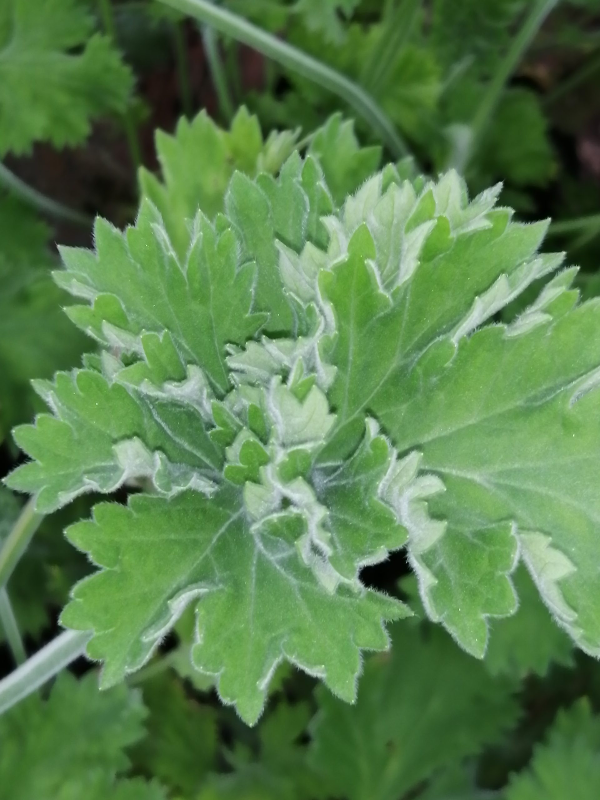 Geranio a foglie arricciate, grandi, aromatiche. Fiori rosse vermiglio con macchia nera sui petali superiori.