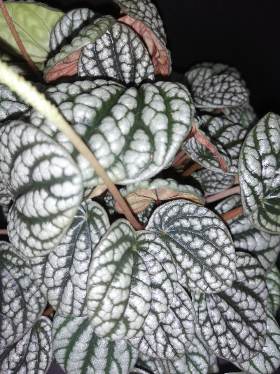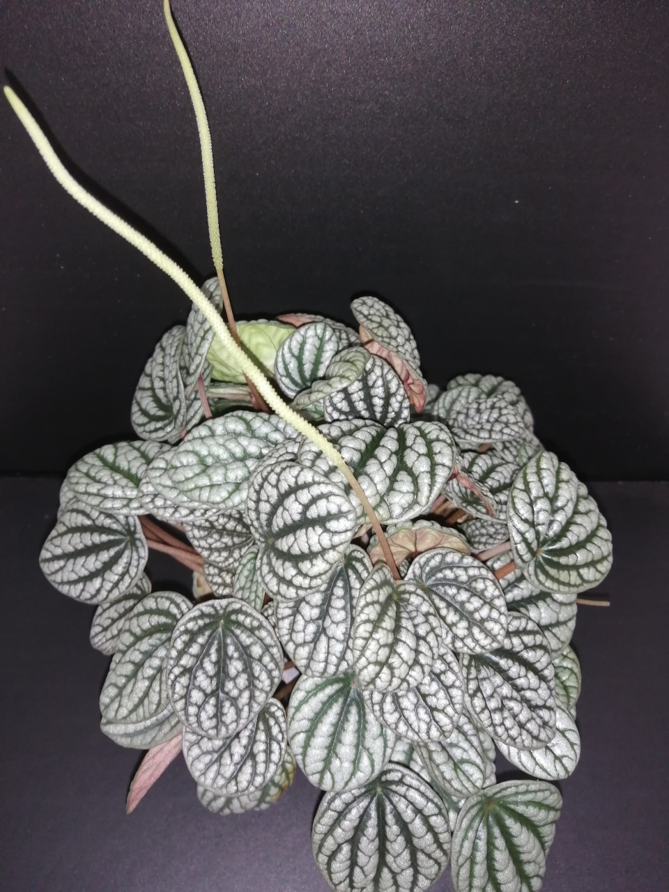 Peperomia a portamento compatto ed arrotondato dal fogliame molto particolare, goffrato, verde scurissimo quasi nero, con rilievi bianco argentei.