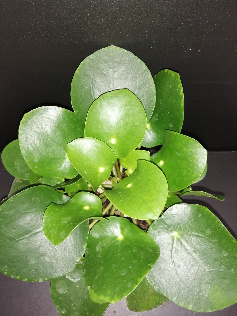 Chiamata Pianta delle Monete Cinesi per la forma delle sue foglie, verde intenso, carnose e considerata un portafortuna.
