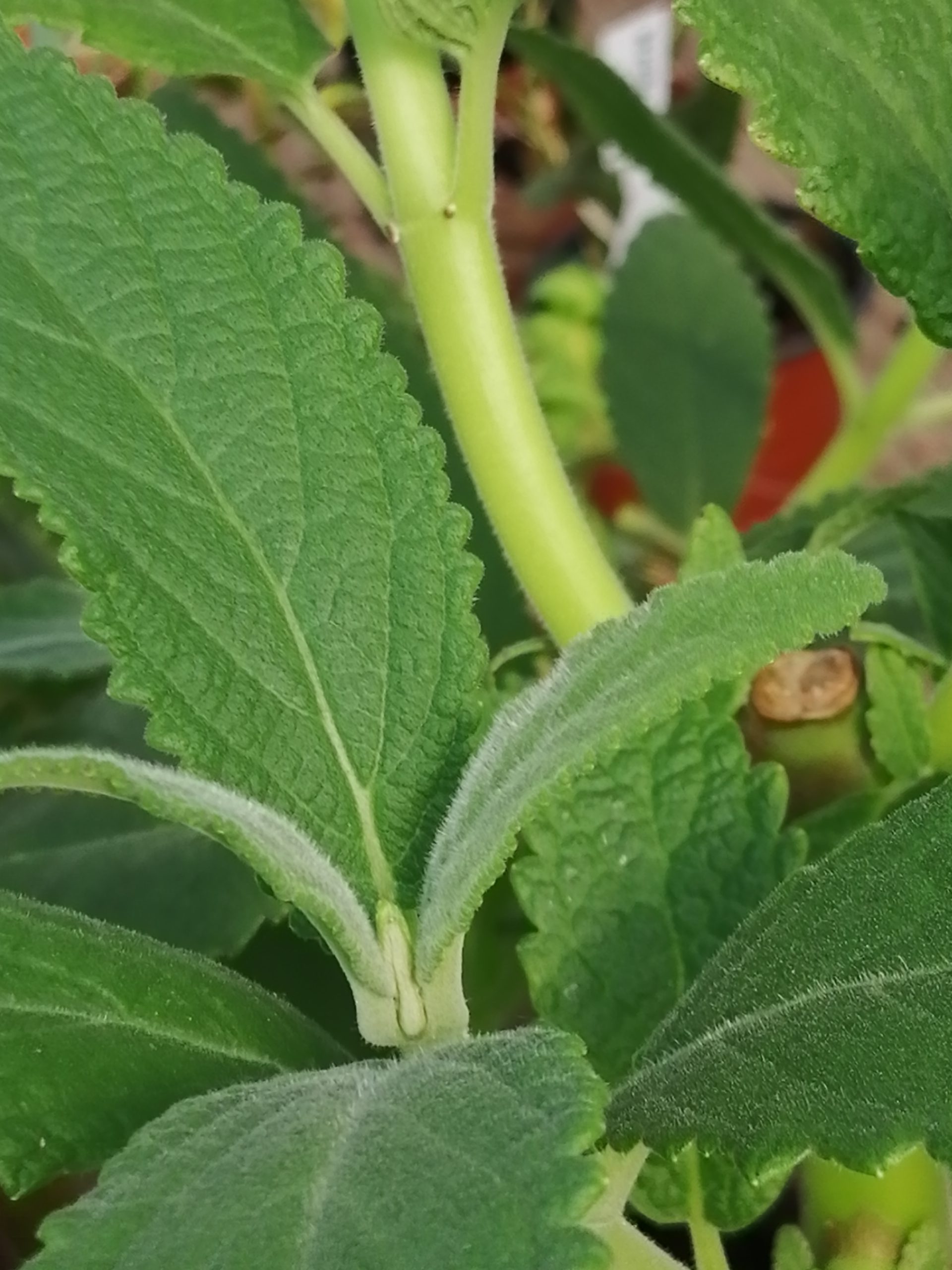 Una nuova varietà a crescita eretta. Grandi foglie verde grigio con margini dentati.
